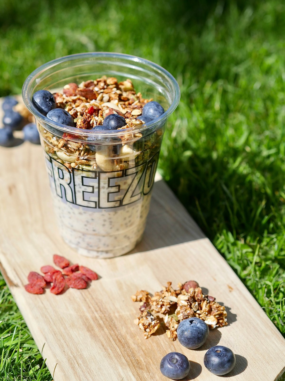 Øko Overnight oats med øko havre, chiafrø, havremælk, yoghurt, vaniljesirup, blåbær, cashewnødder, græskarkerner, solsikkekerner, gojibær, granola og honning.