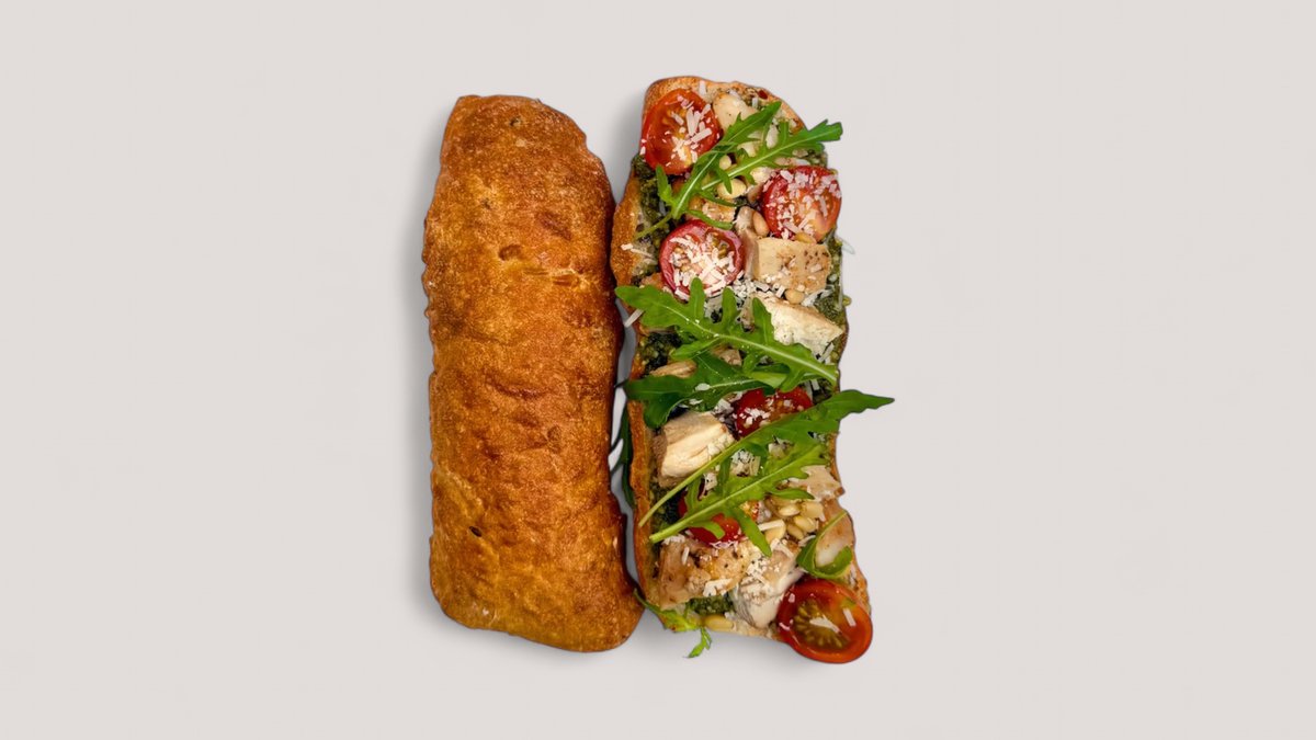 Øko ciabatta med fyld af økologisk kyllingelår, hjemmelavetpestomayo, parmesan, rucola, pinekerne og cherry tomat.