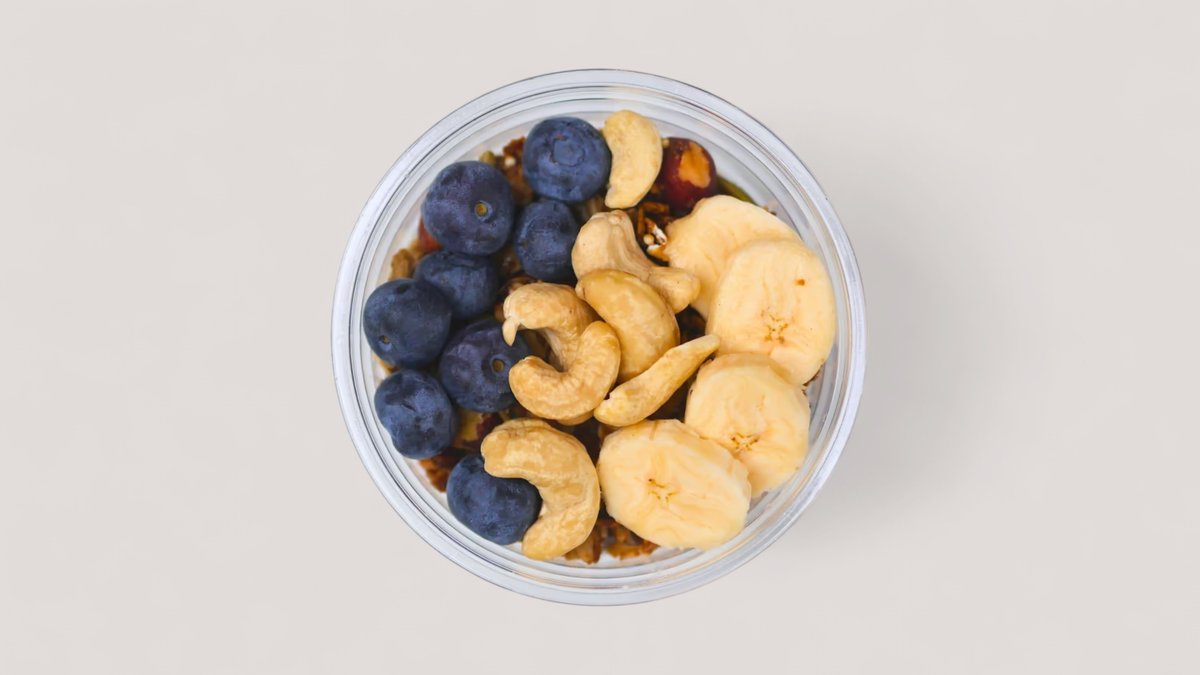 Øko overnight oats med øko kefir, blåbær, banan, granola, mandelstykker, cashew, græskerne, soldikkerner og honning.