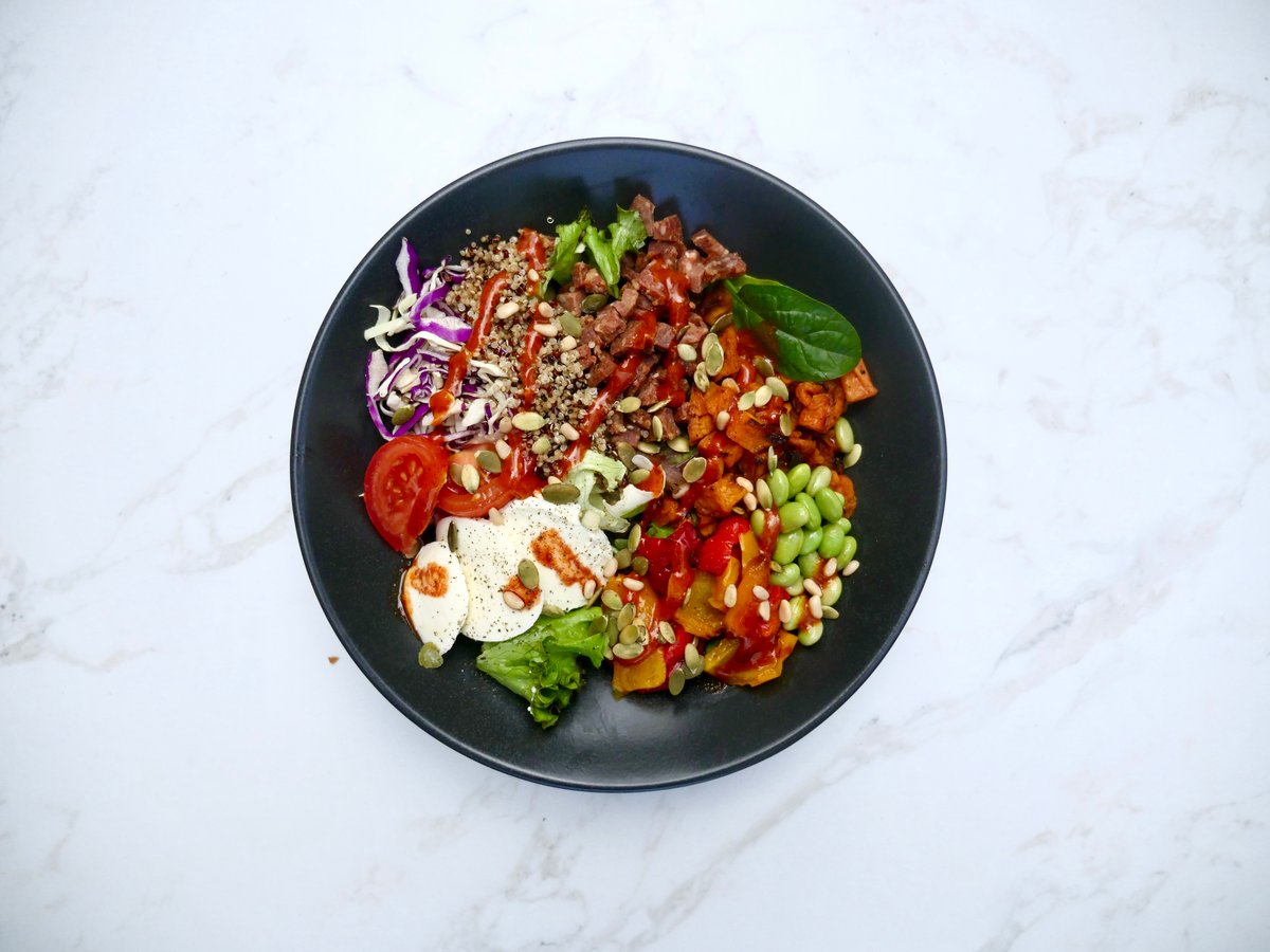 Salat med chorizo, søde kartofler, quinoa, grillede peberfrugter, edamamebønner, mozzarella og røget peperfrugt dressing