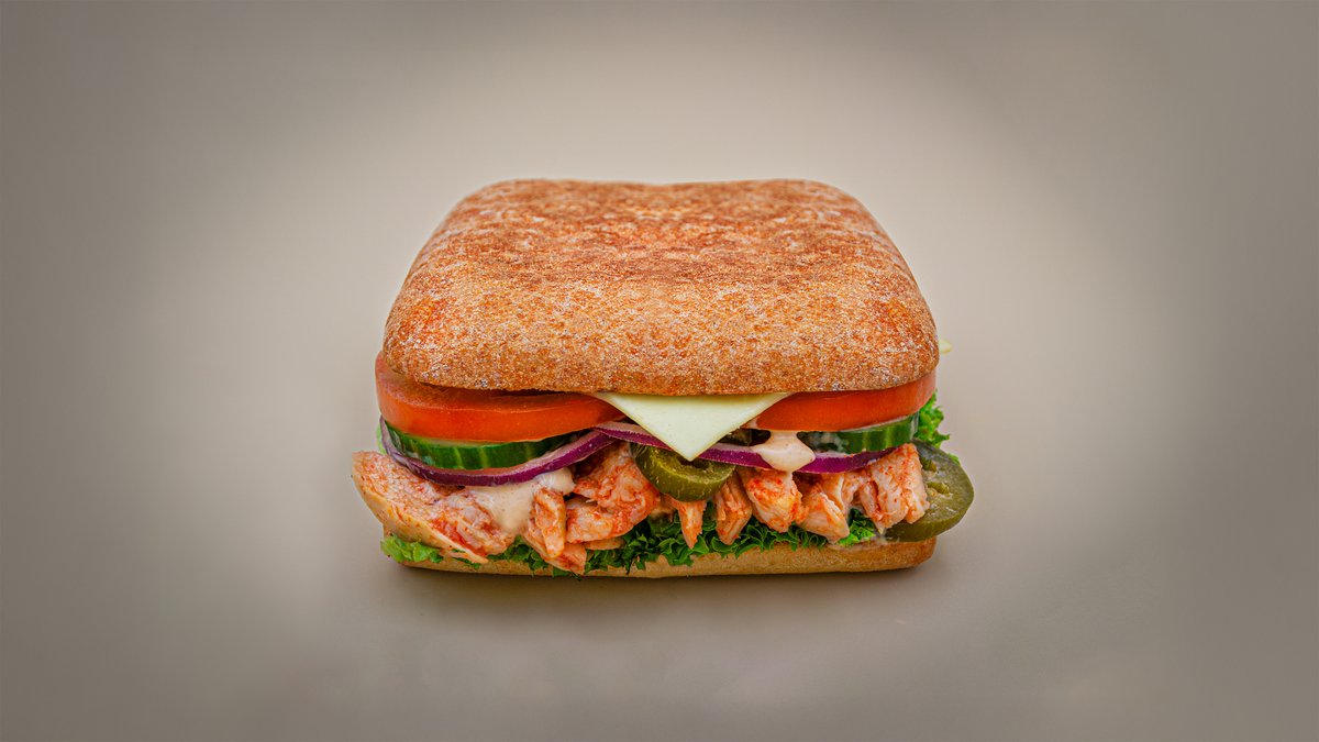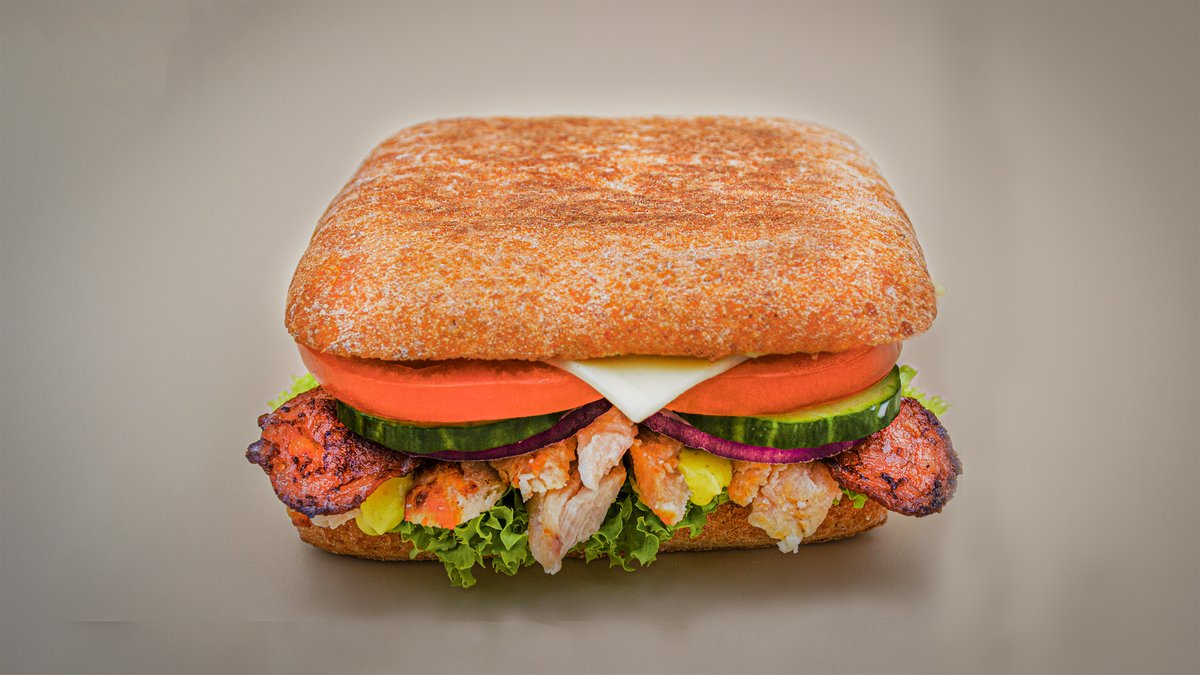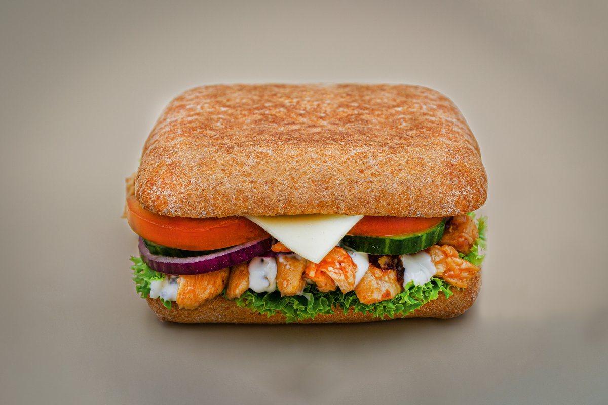 Lyst fuldkornsbrød, mayonnaise, barbecue marineret kylling, salat, agurk, tomat, rødløg, ost og crème fraîche dressing.