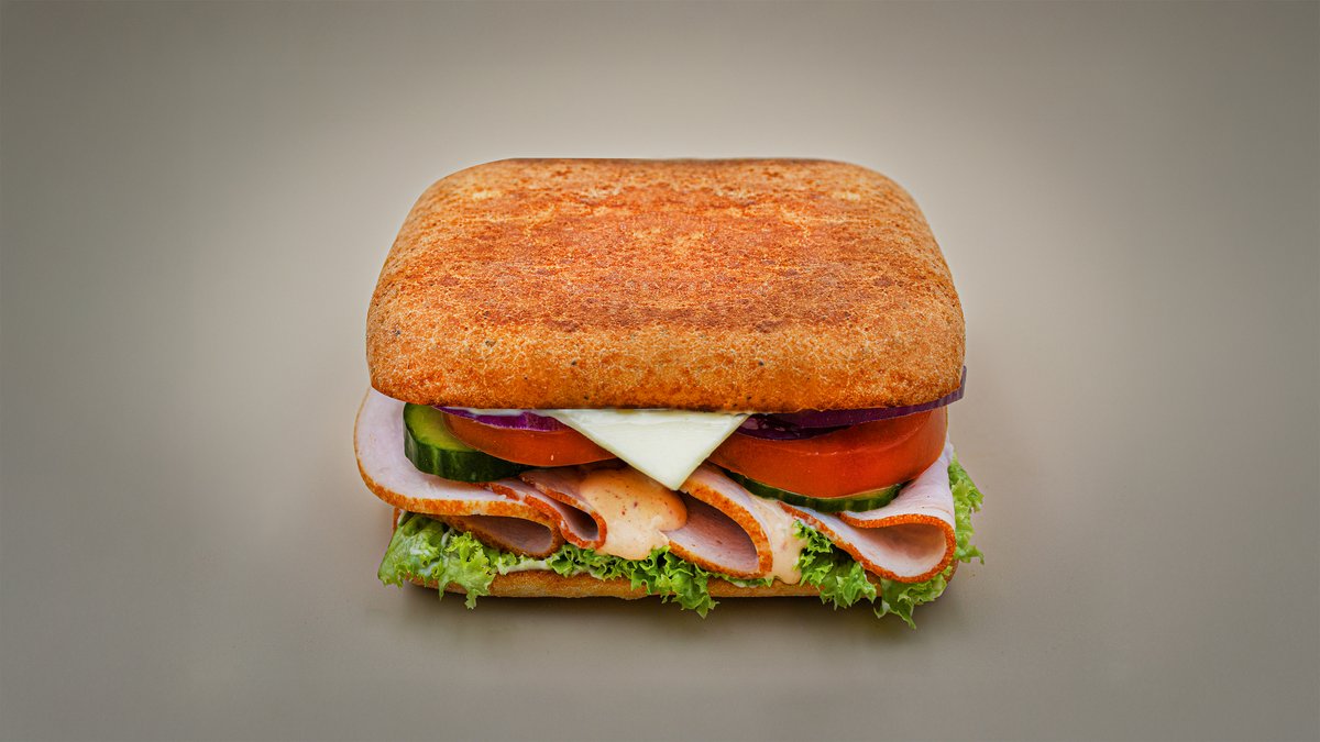 Chilibrød, aioli, kalkun slices, salat, agurk, tomat, rødløg, mild ost og mild chili dressing