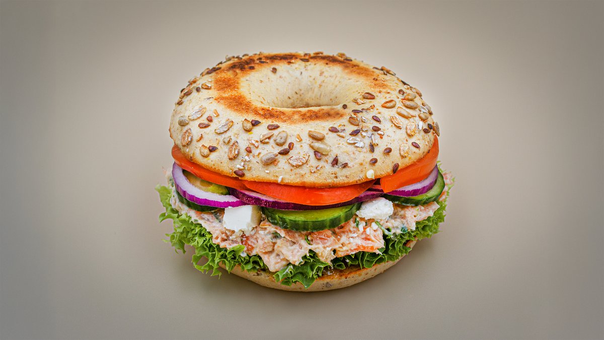 Grov bagel, mayo, laksemousse, salat, agurk, tomat, rødløg, salat ost, syltede rødkål og mild chili dressing