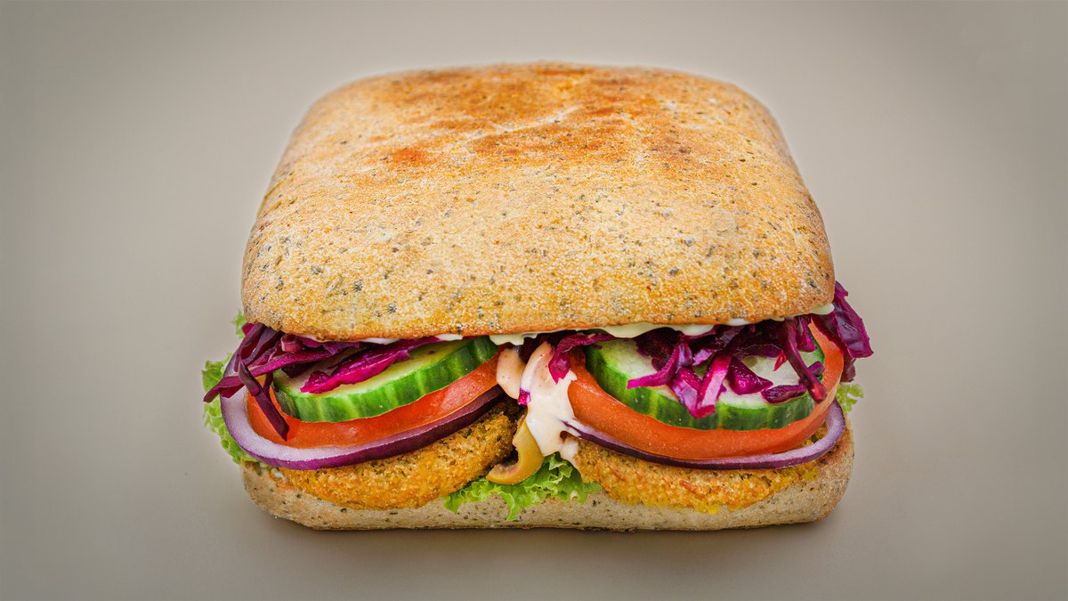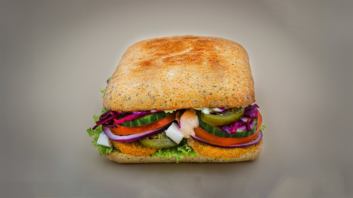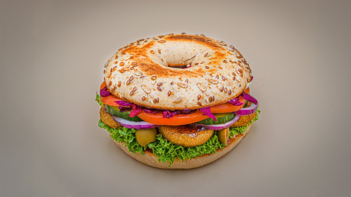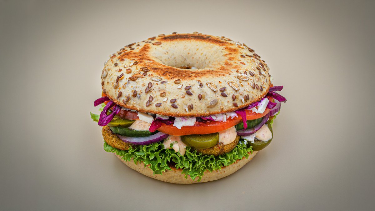 Grov bagel, vegansk mayonnaise, falafel, salat, agurk, tomat, rødløg, oliven, syltet rødkål og vegansk dressing.
