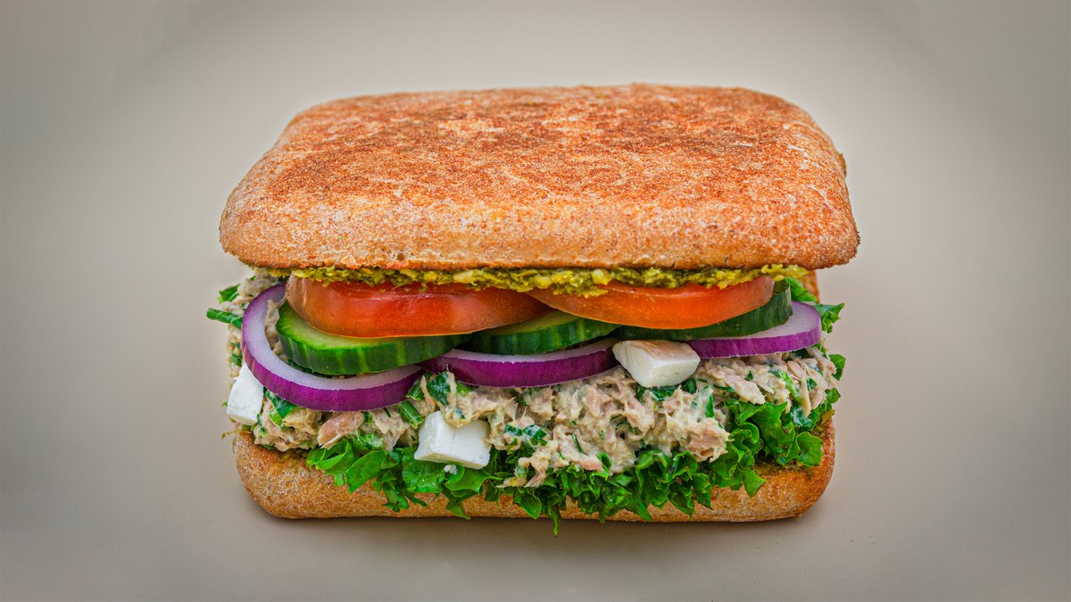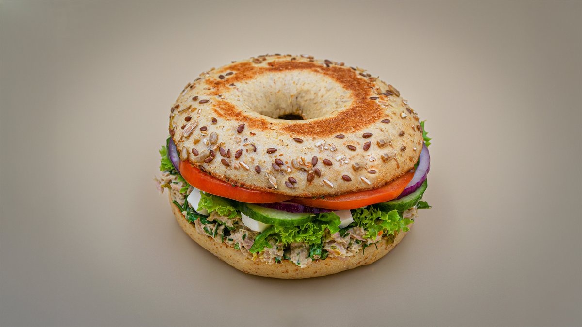 Grov bagel, grøn pesto, tunmousse, salat, agurk, tomat, rødløg, majs, salat ost og creme fraiche dressing