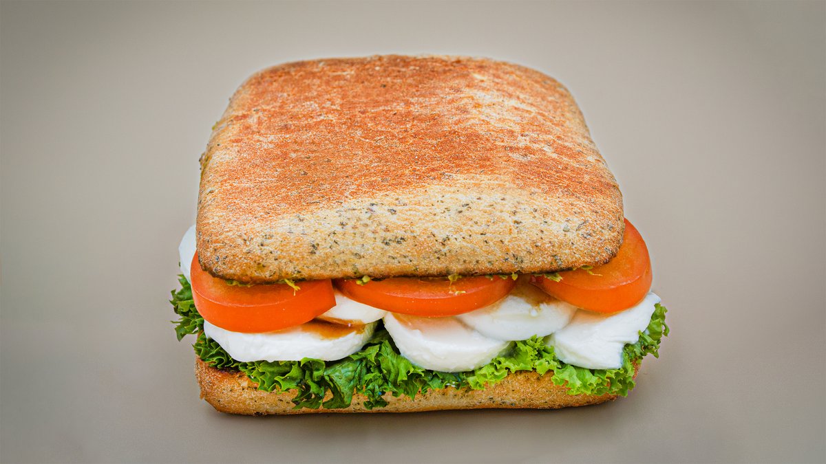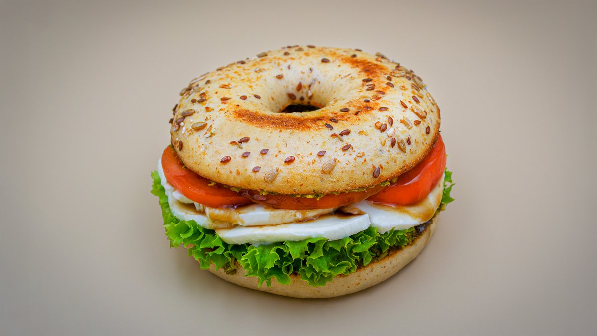 Grov bagel, grøn pesto, mozzarella, salat, tomat og granatæble balsamico