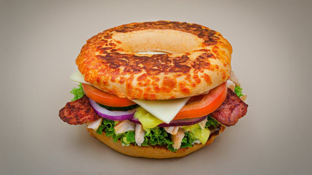 Chili cheddar bagel, mayonnaise, kylling, kalkun bacon, salat, agurk, tomat, rødløg, ost og karrydressing