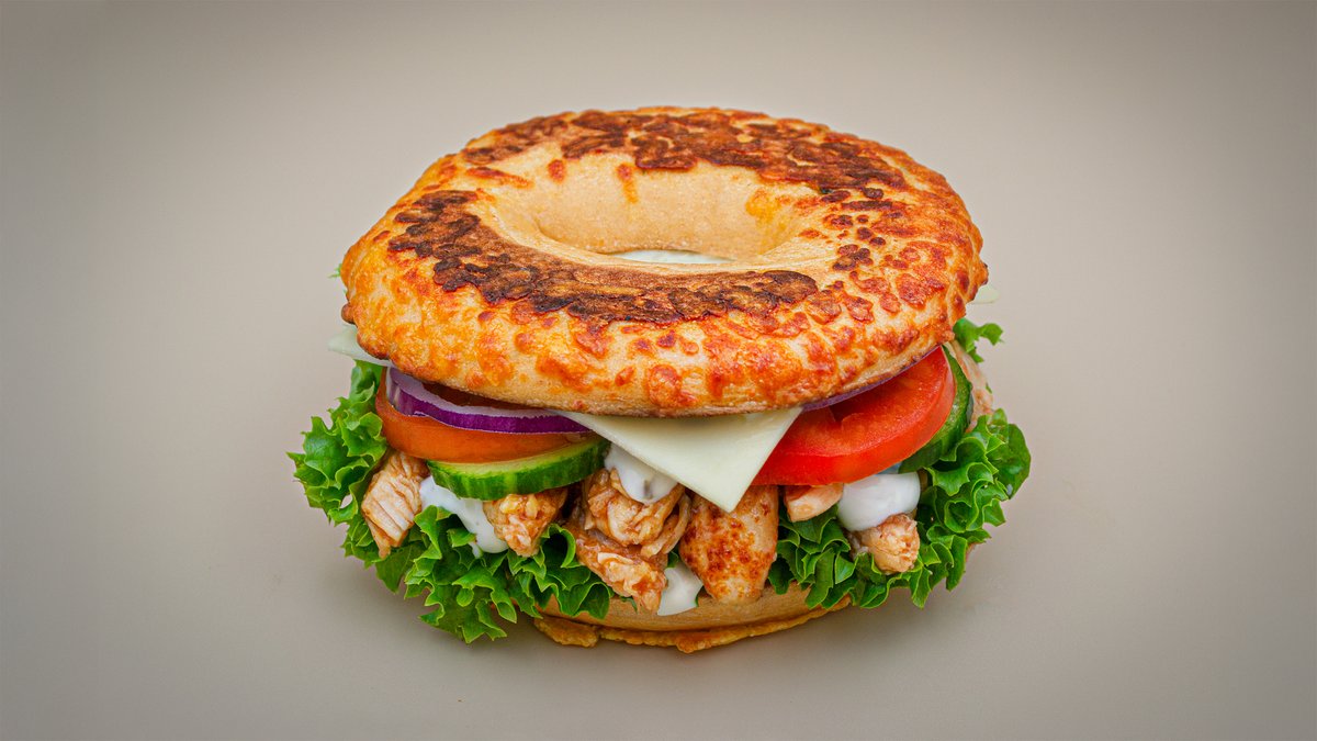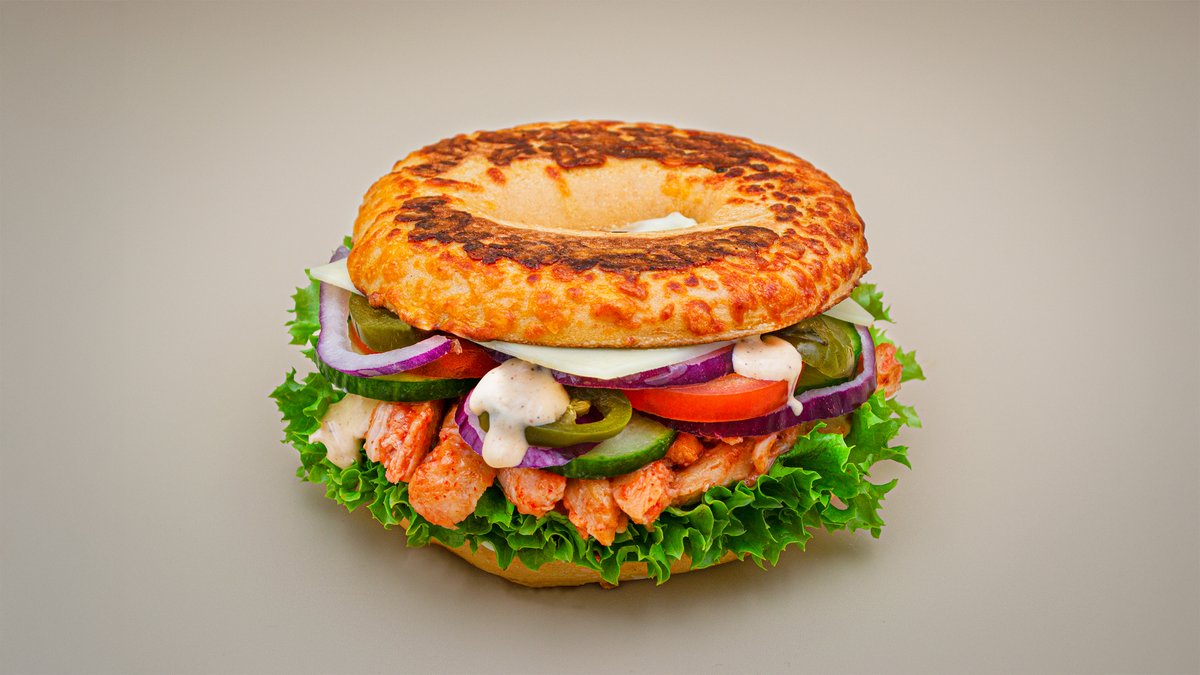 Chili cheddar bagel, aioli, chilimarineret kylling, salat, agurk, tomat, rødløg, ost, jalapeños og mild chilidressing