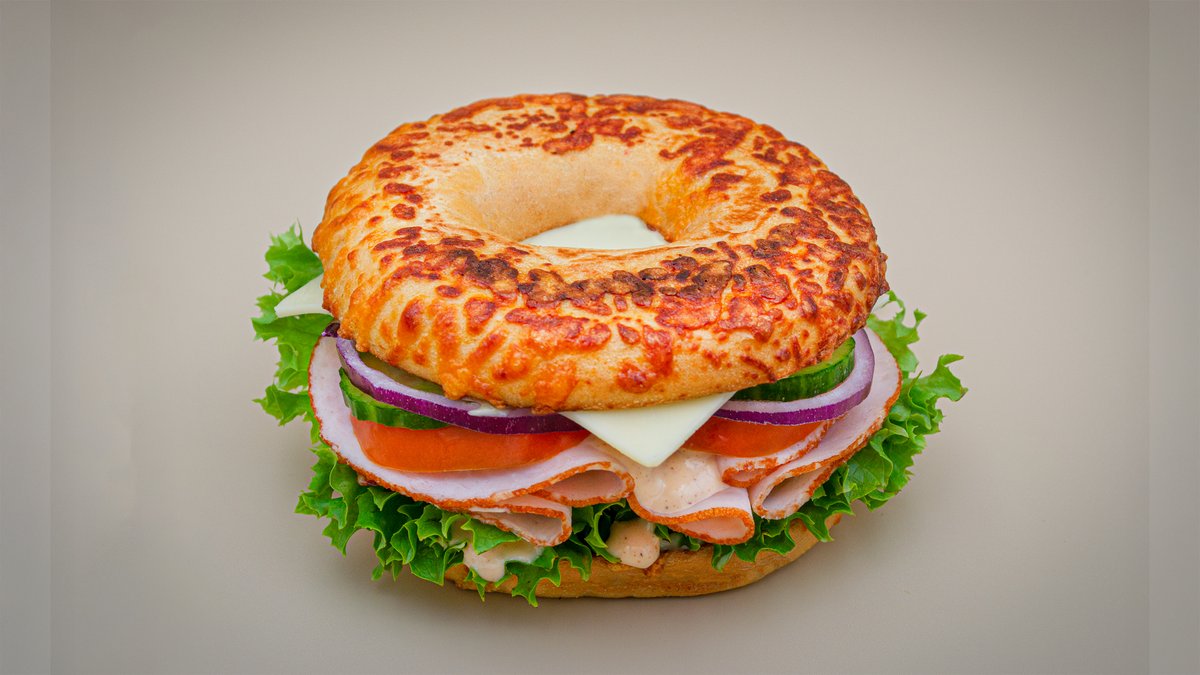 Chili cheddar bagel, aioli, kalkun, salat, agurk, tomat, rødløg, ost og mild chilidressing