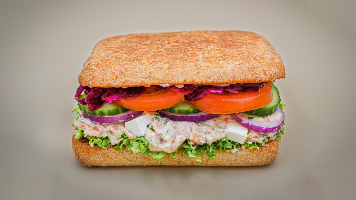 Lyst fuldkornsbrød, mayo, laksemousse, salat, agurk, tomat, rødløg, salat ost, syltede rødkål og mild chili dressing.