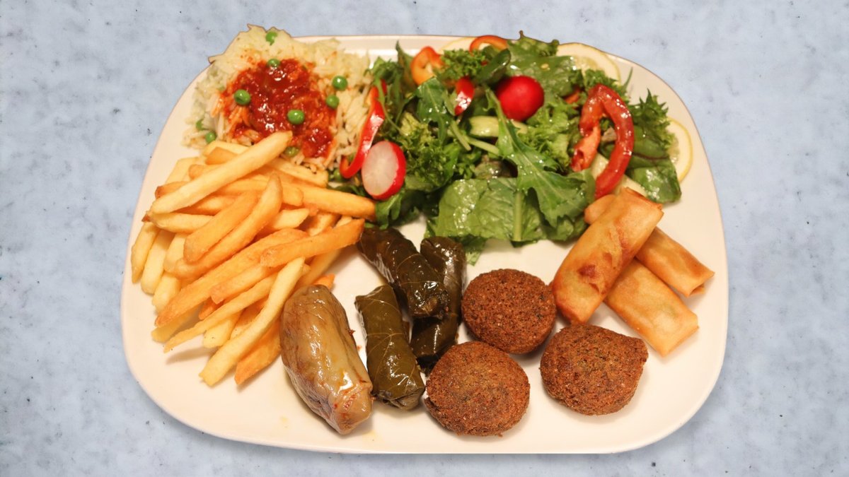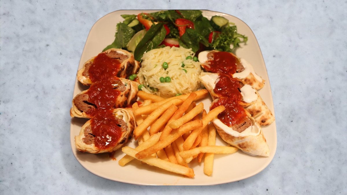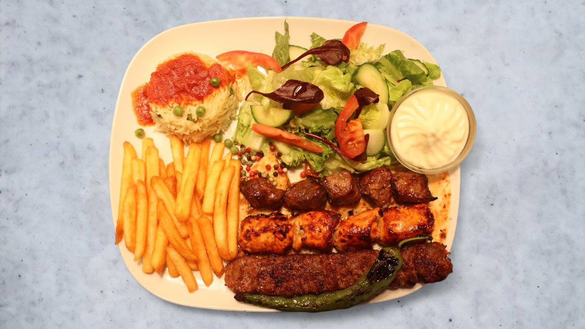 Kyllingespyd, kalvespyd, oksespyd og döner kebab. Serveres med valgfri sodavand, ris, pommes frites og salat.