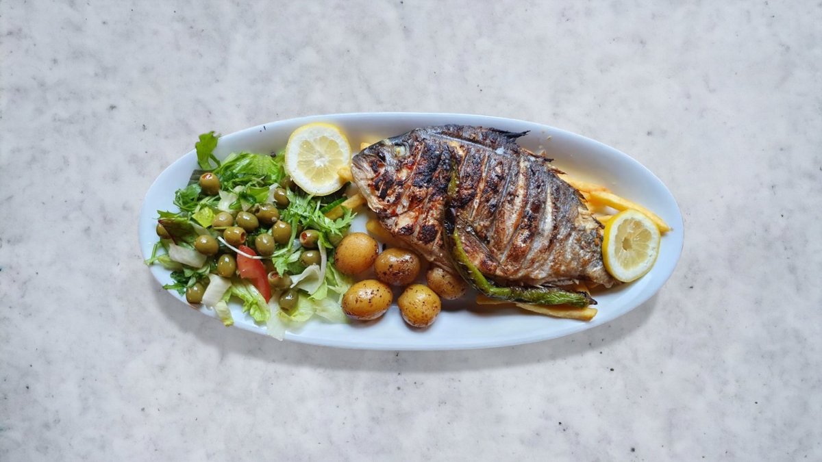Grillet fisk med grillede grøntsager og salat. Serveres med valgfri sodavand og petit kartofler eller pommes frites.