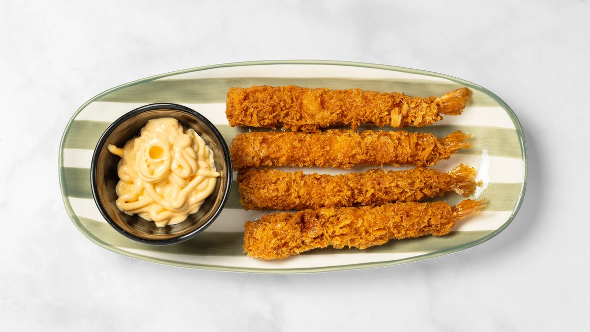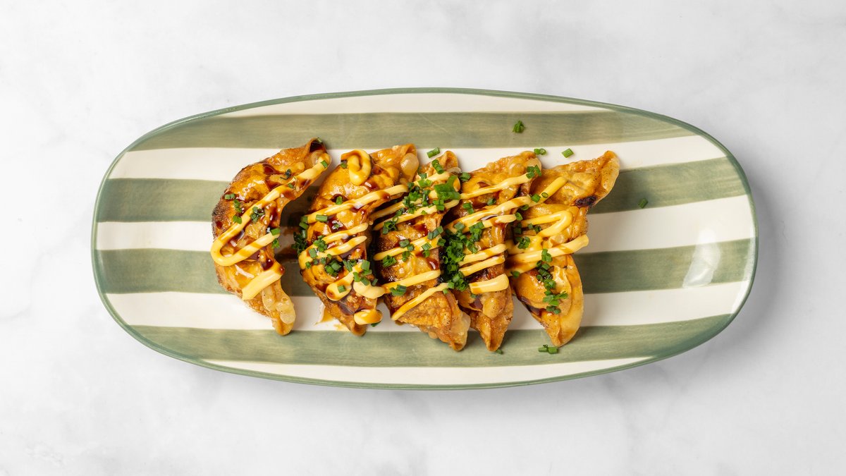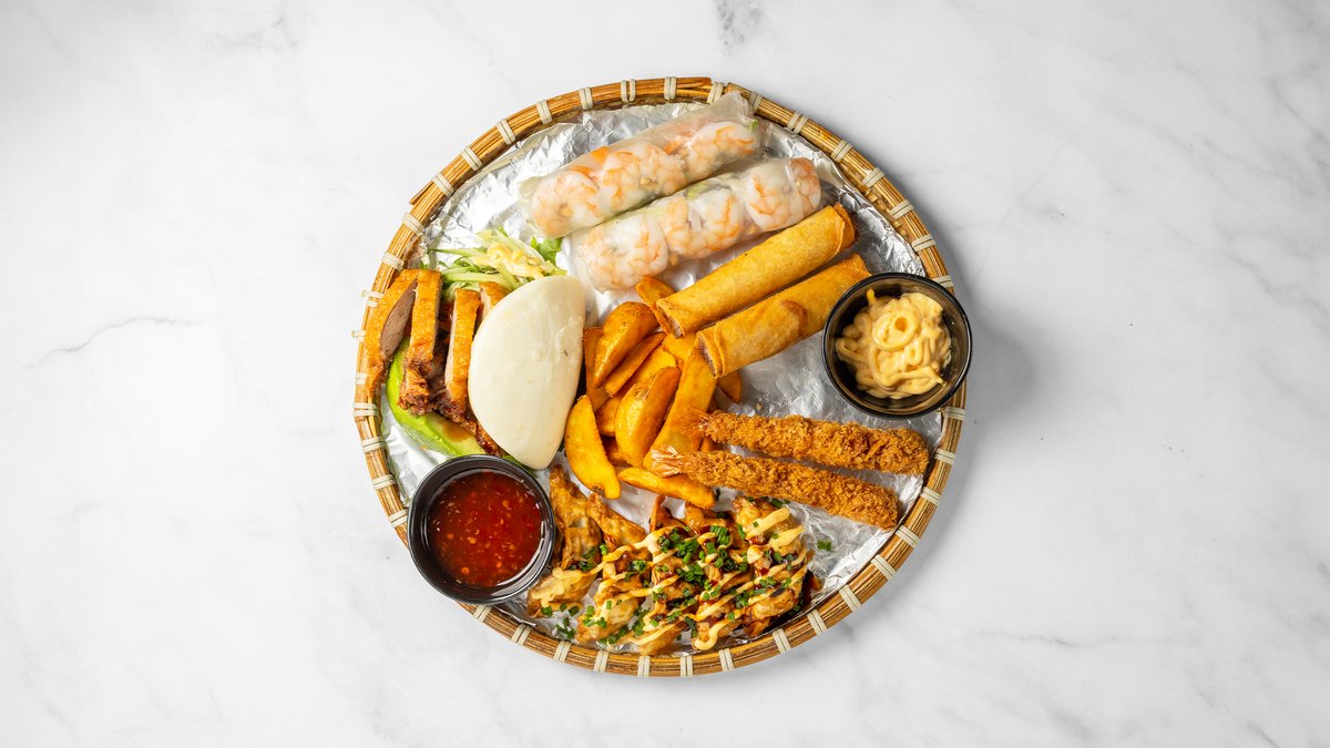Snackkurv med gyoza, forårsruller og indbagte rejer.