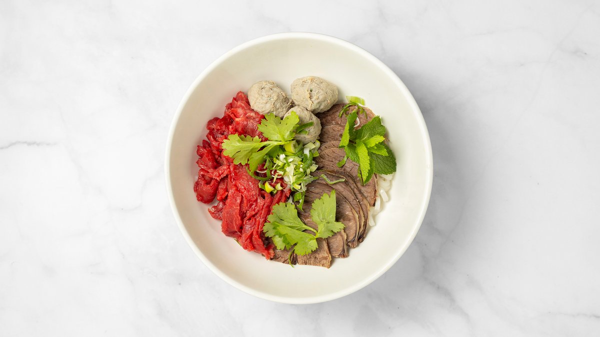 Risnudel suppe med kødboller og oksekød, toppet med sød basilikum, bønnespirre og lime.