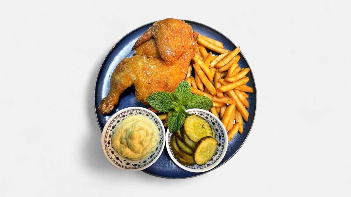 Halv grillkylling med agurkesalat og valgfrit tilbehør.