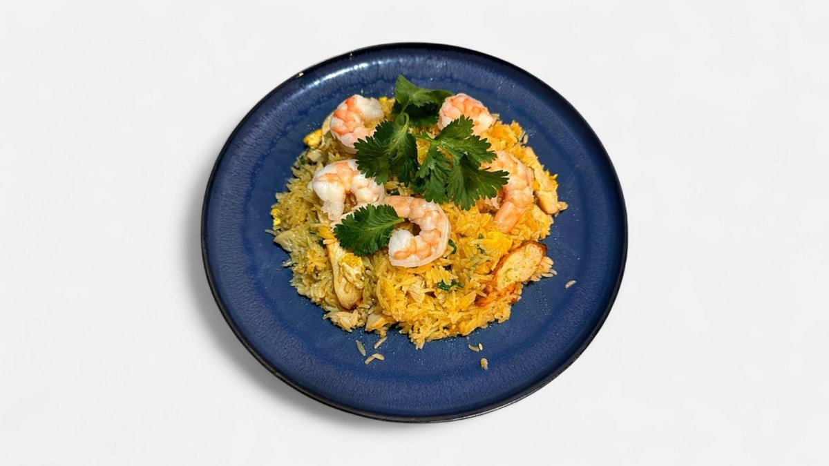 Ris dej med blanding af hakket svinekød og judasøre svampe med fiskesovs.