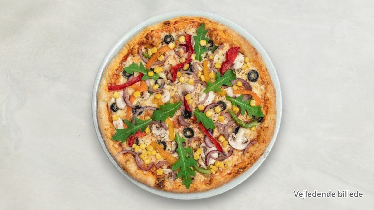 Hjemmelavet tomatsauce, ost, champignon, majs, løg, rød- og grøn peber.