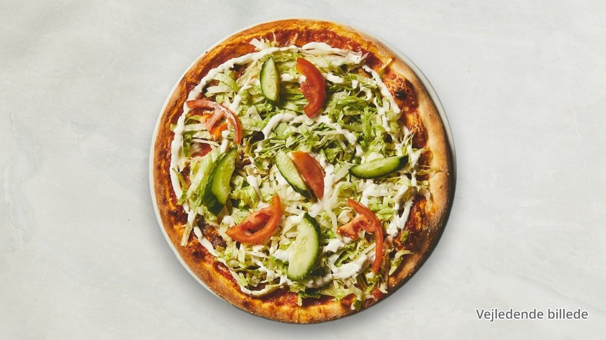 Hjemmelavet tomatsauce, ost, kebab, chili, hvidløg, salat, friske tomater og creme fraiche dressing.