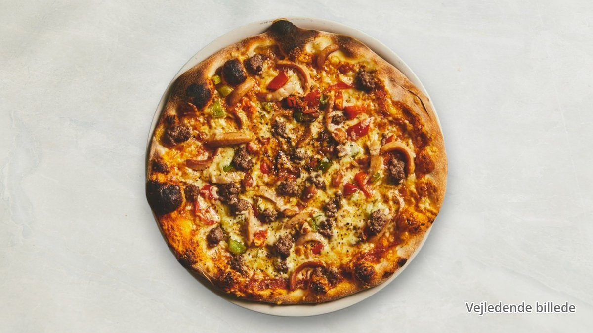 Hjemmelavet tomatsauce, ost, pepperoni, champignon, gorgonzola og oksekød.