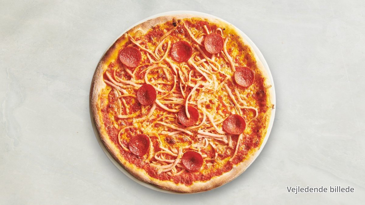 Hjemmelavet tomatsauce, ost, skinke og pepperoni.