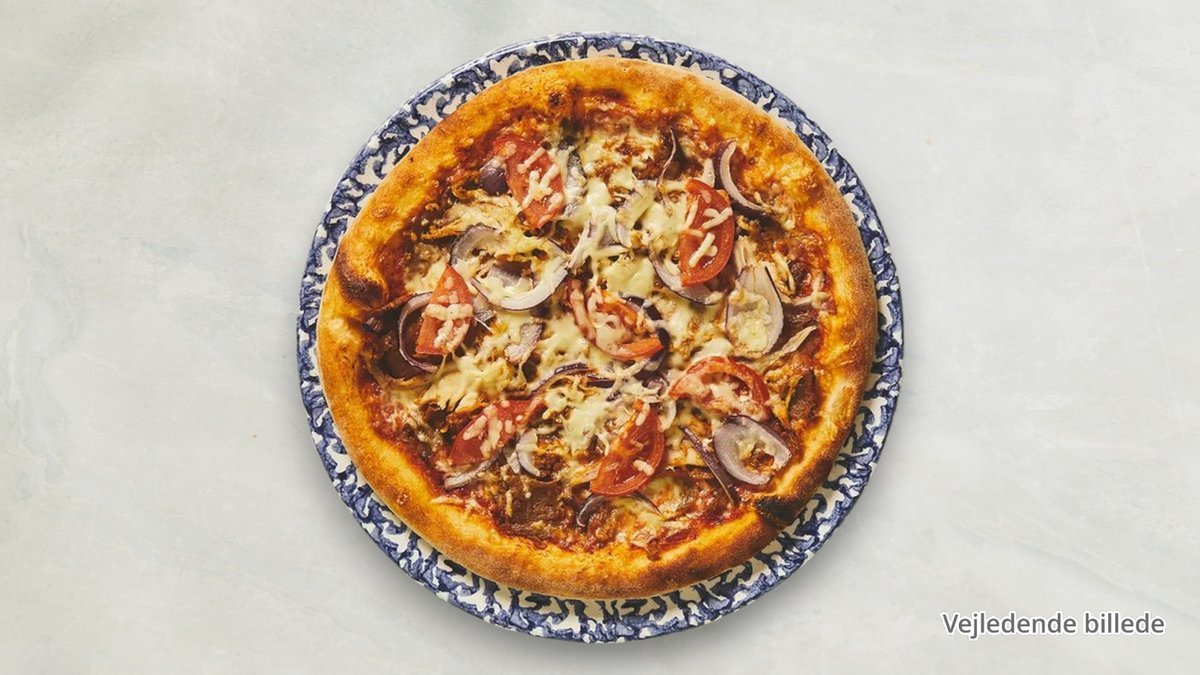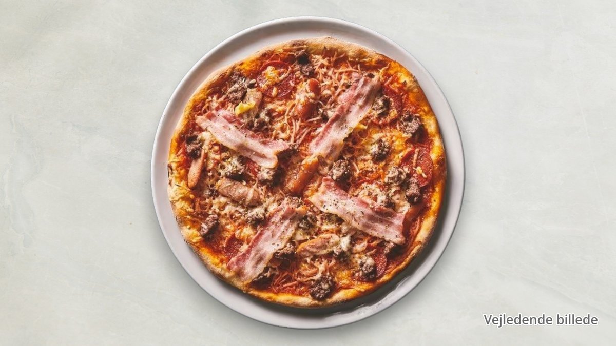 Hjemmelavet tomatsauce, ost, skinke, pepperoni og bacon.