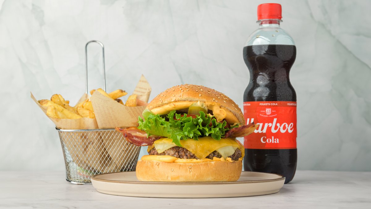 Bacon, cheddar, hjemmelavet romanesco, mayonnaise, salat og løg. Serveres med pommes frites og valgfri sodavand.