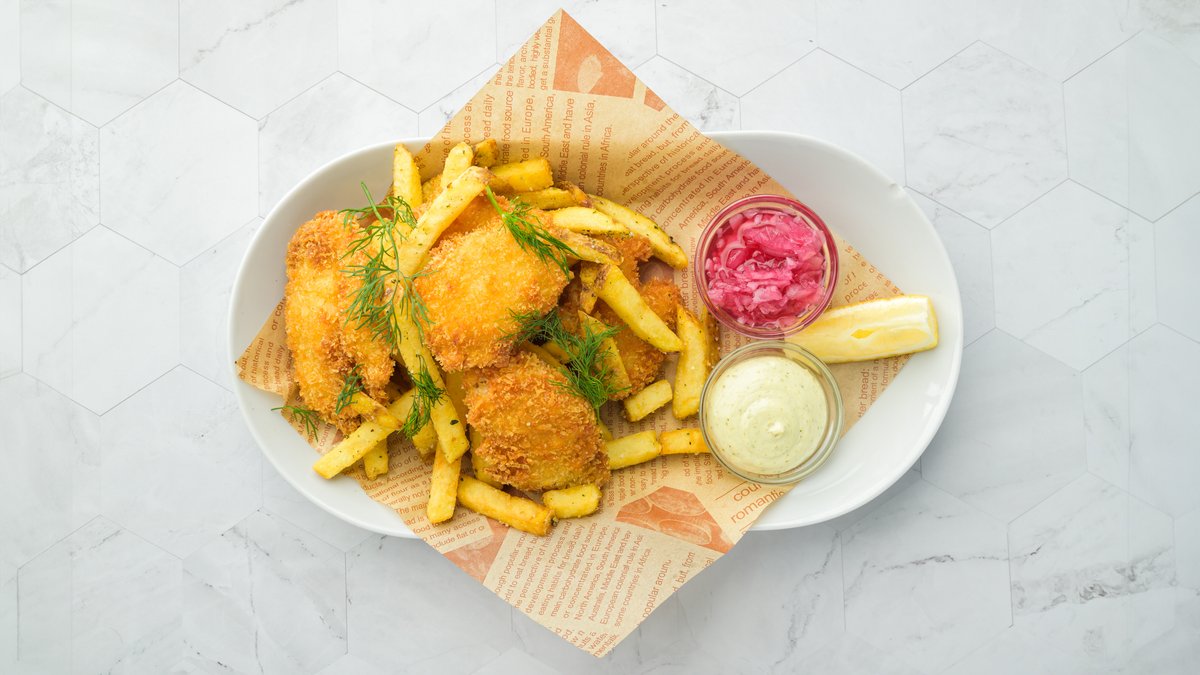 Serveret med sprøde pommes frites, tatarsauce og frisk citron.
