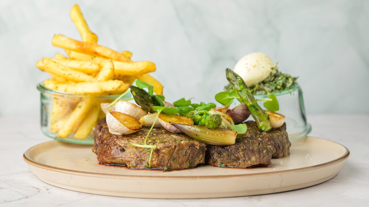 Steak med smør og pommes frites. Serveres med sæsonens grønt.
