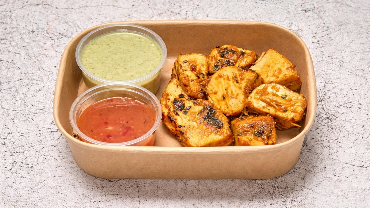 Marinerede stykker af kyllingefilet med Raita og Sød Mango Chutney.