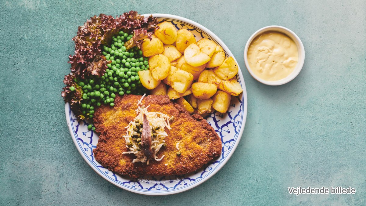 Serveres med pommes frites og remoulade.
