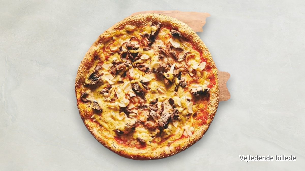 Indbagt pizza med mozzarella, svampe og kogt skinke.