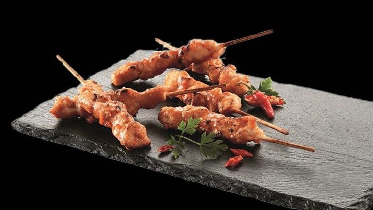 3 sticks Yakitori Kyllingespyd med kyllingebrystfilet, PEANUTS, kokosmælk, soja, gurkemeje, spidskommen, chili, citrongræs og kaffirlime Hvert spyd vejer ca. 30 gram