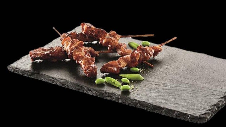 3 sticks Yakitori Kyllingespyd med kyllingebrystfilet, sojasauce, HVEDEMEL, eddike og mirin Hvert spyd vejer ca. 30 gram