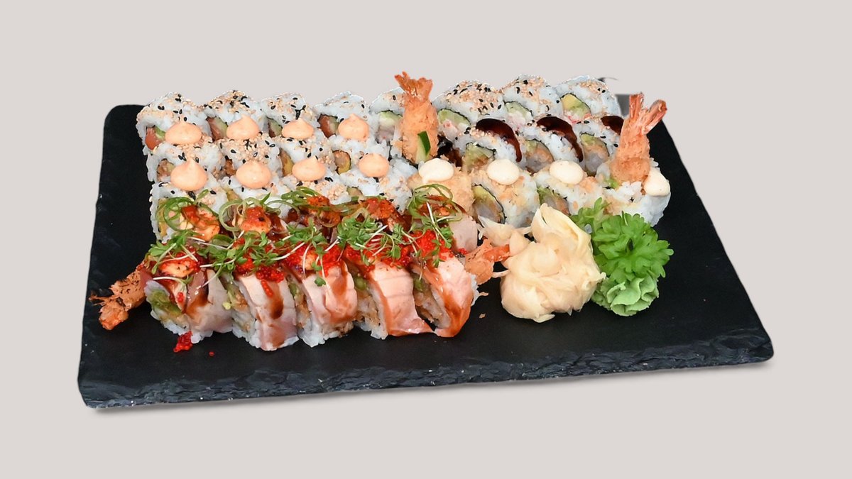 Indeholder : Hot Tun Dragon Kaburimaki (5 stk.) Crispy Deluxe Kaburimaki (5 stk.) Crispy Laks UM (8 stk.) (Crispy laks, mango. Toppet med sesam og chilimayo) Salmon UM (4 stk.) California UM (4 stk.) Crispy Ebi UM (4 stk.) Crunch UM (4 stk.) 2 stk. Chilimayo NB! Udskiftning ej mulig. Du kan bestille menuen fra i dag og med d.31-december-2025.