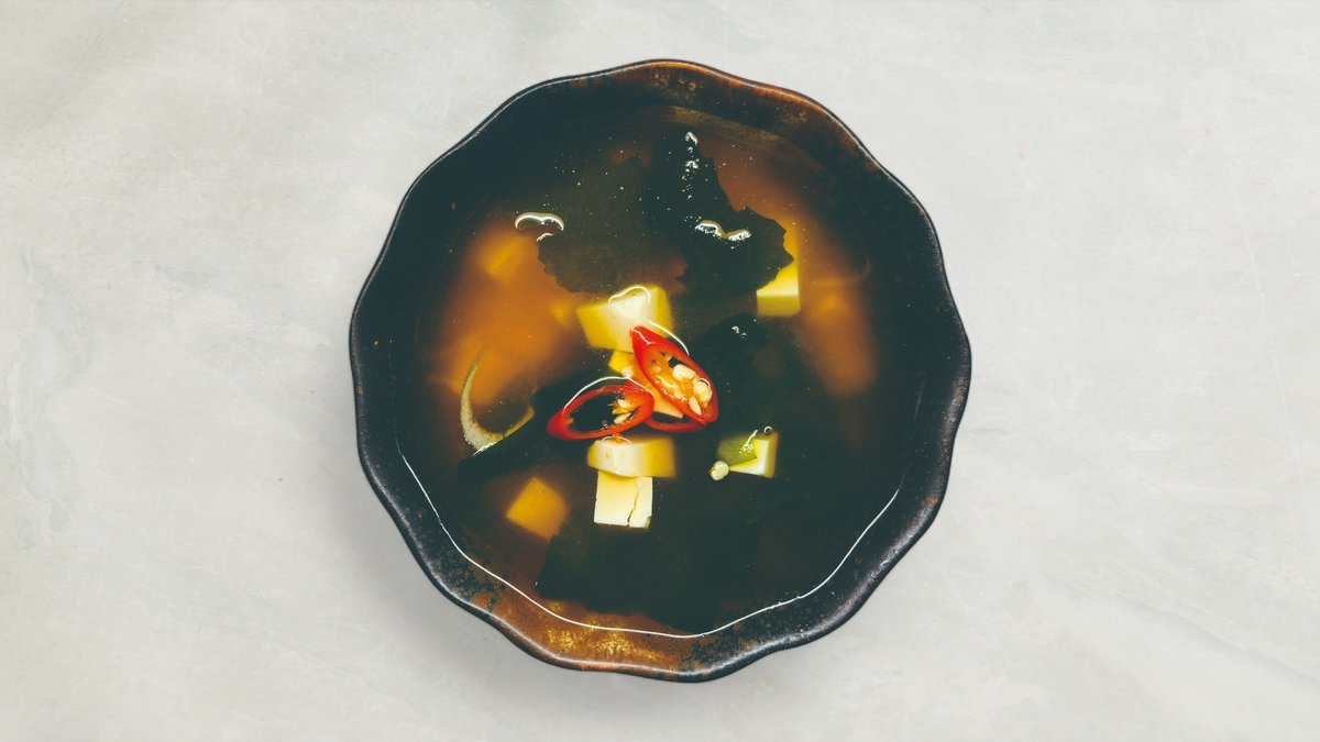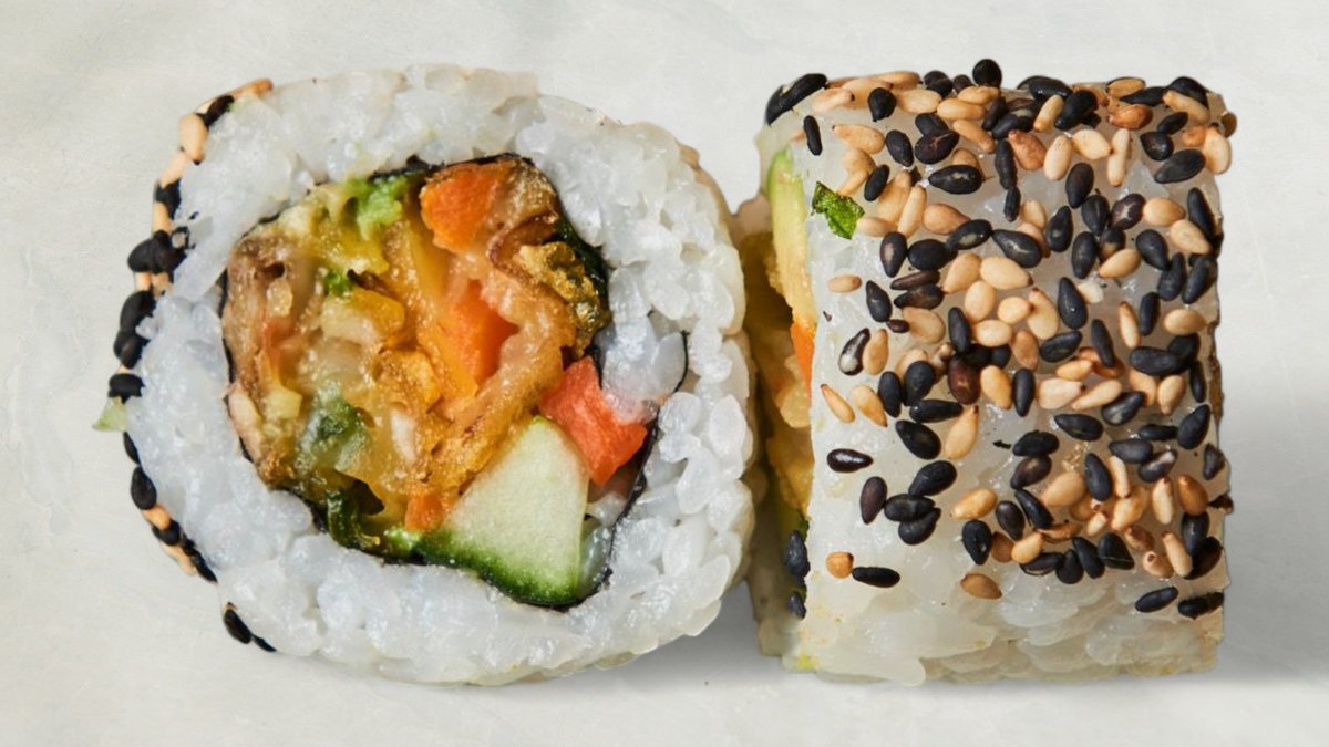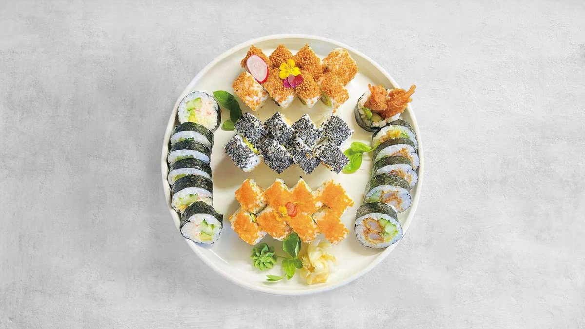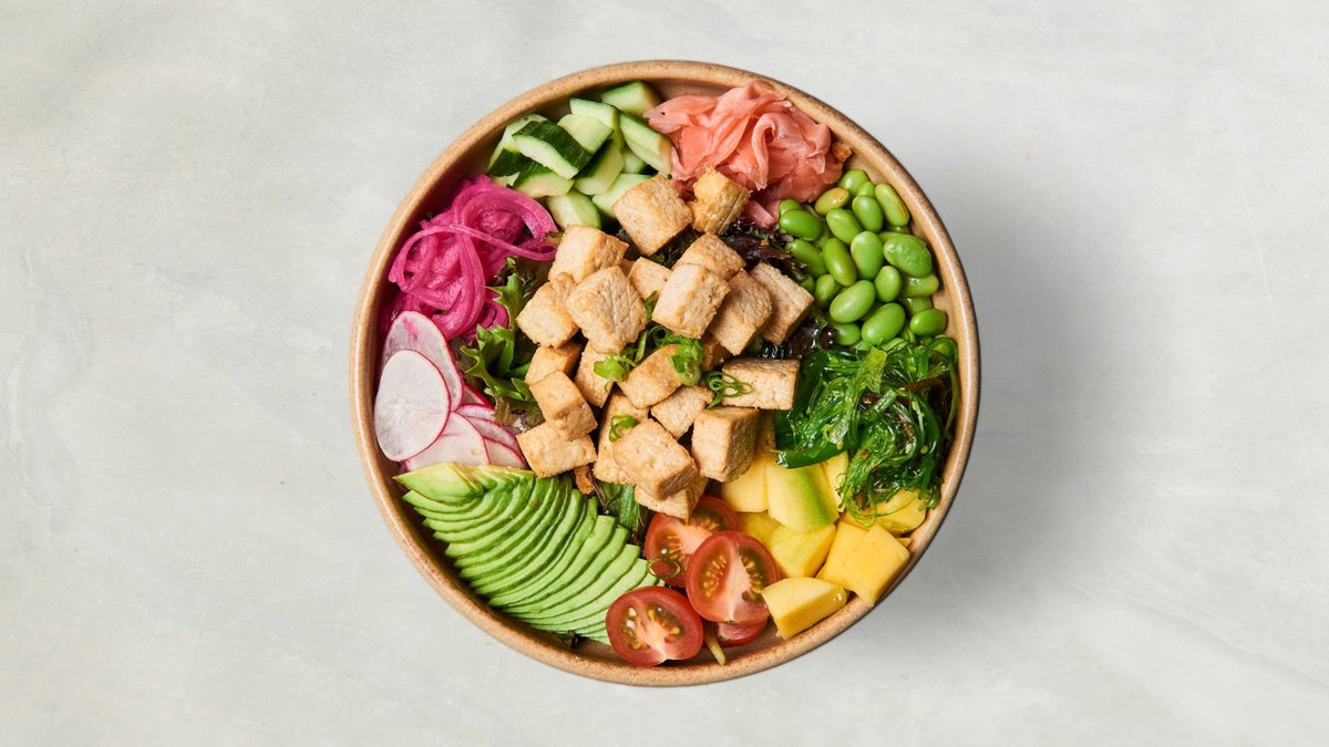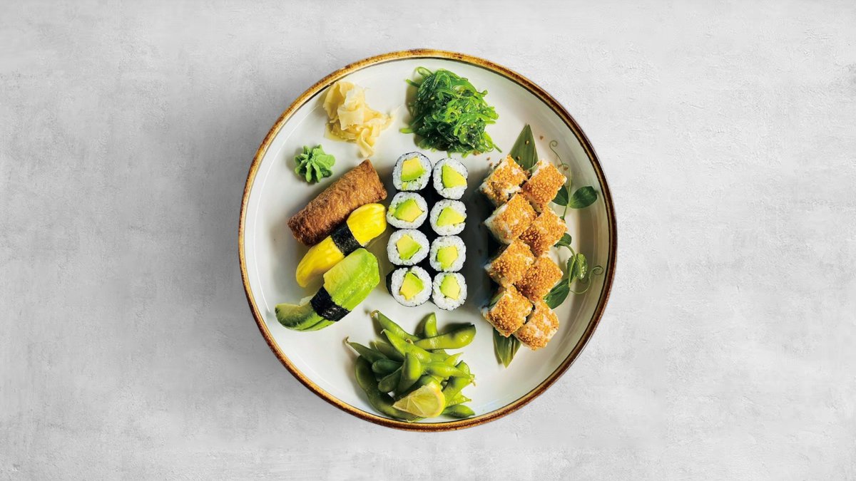 Tofu, sushi-ris, agurk, avocado, tangsalat, edamame-bønner, marinerede rødløg, radiser, mango, ingefær, gulerødder og forårsløg.