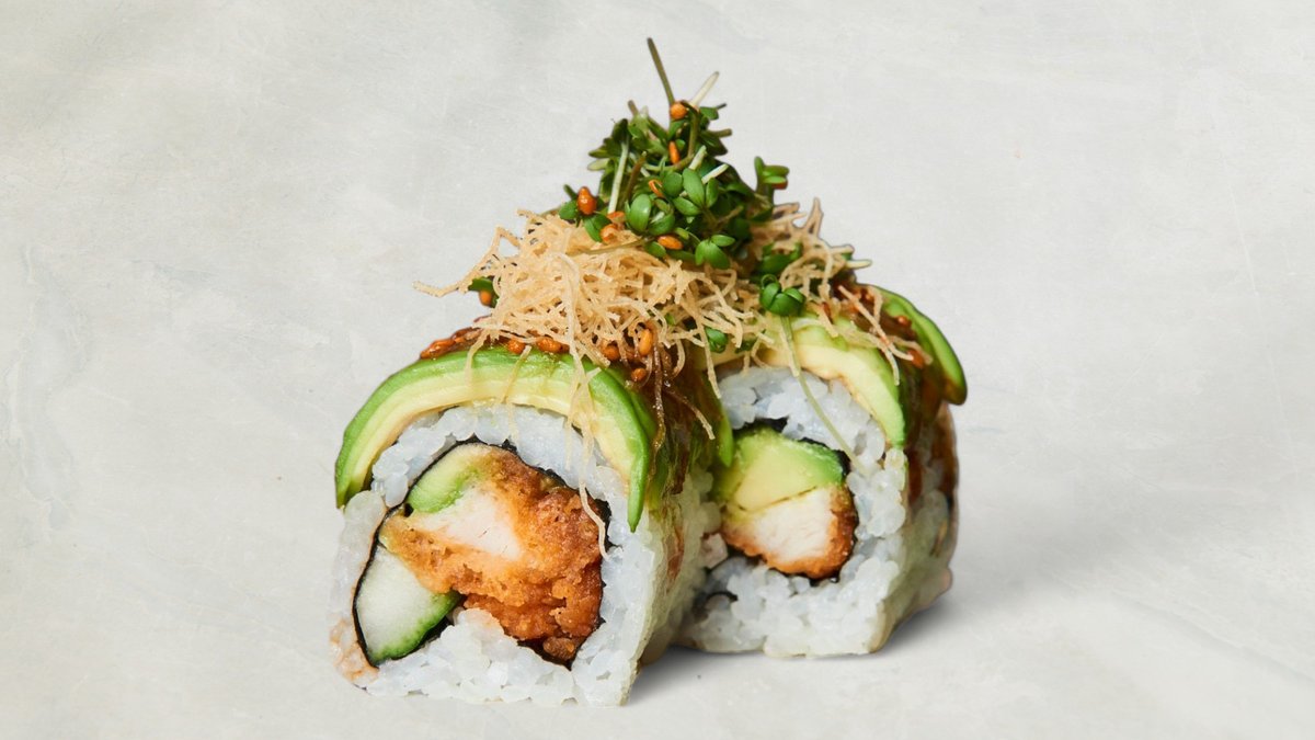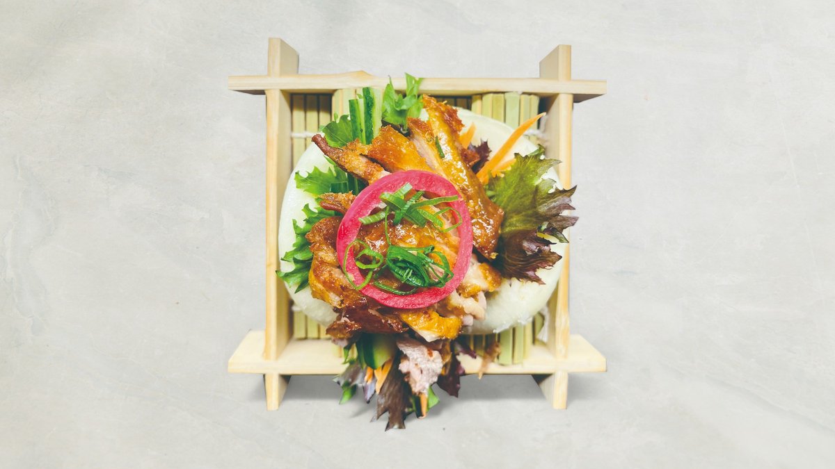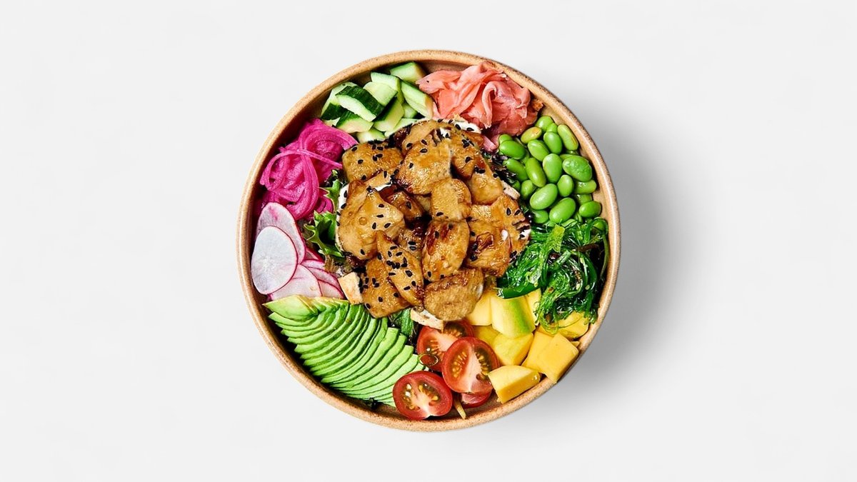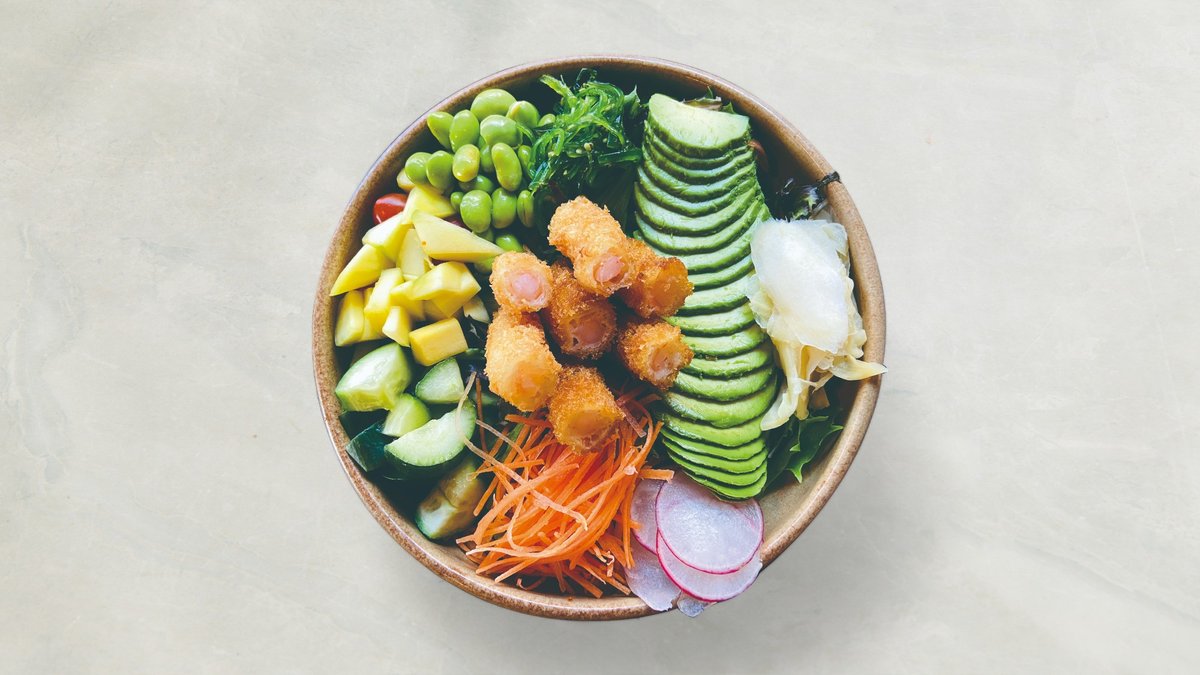 Crispy kylling, sushi-ris, agurk, avocado, tangsalat, edamame-bønner, marinerede rødløg, radiser, mango, ingefær, gulerødder og forårsløg.