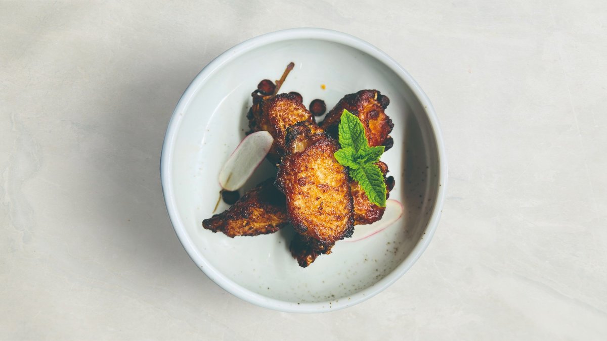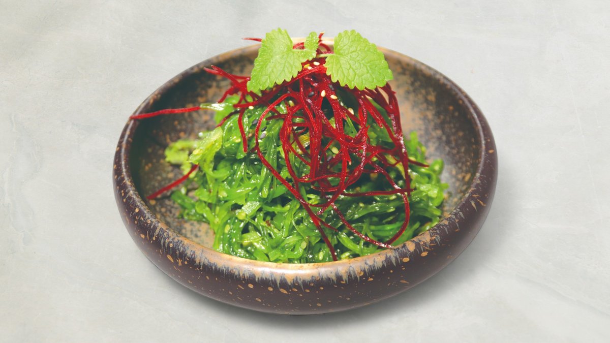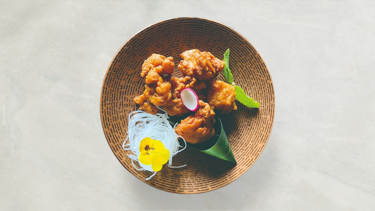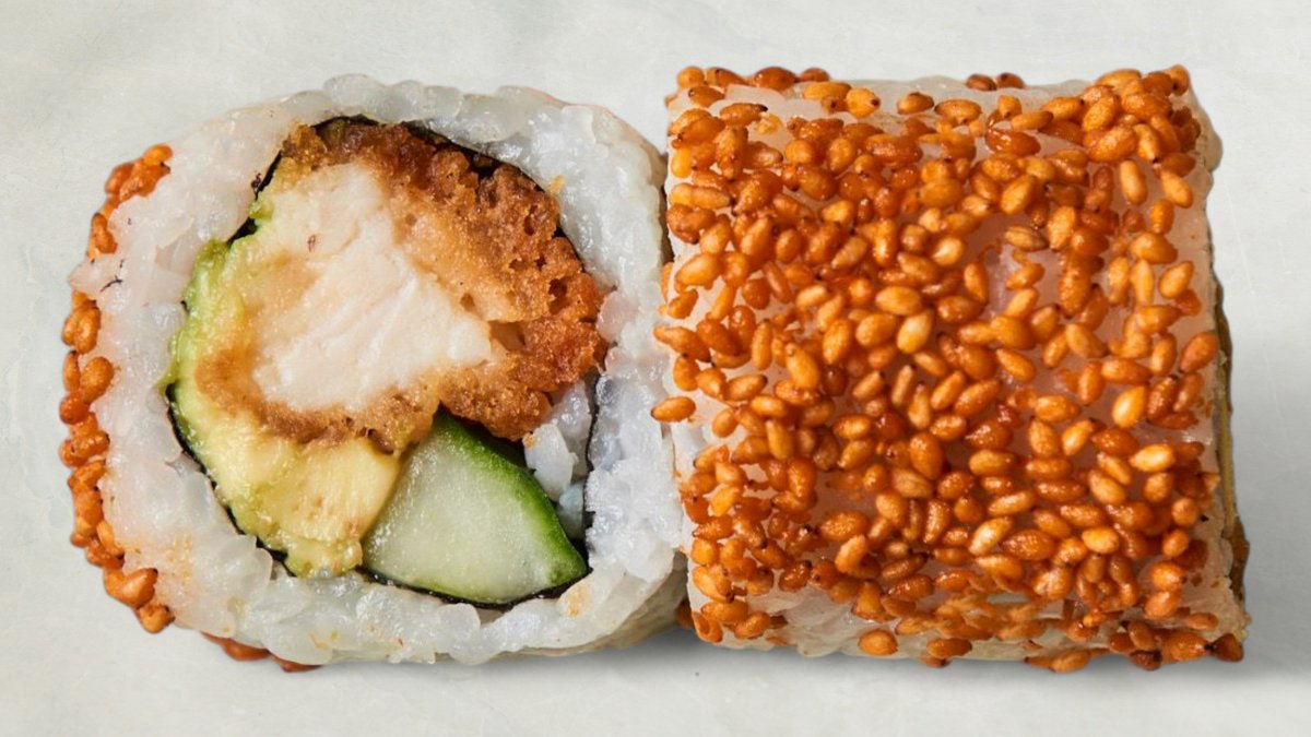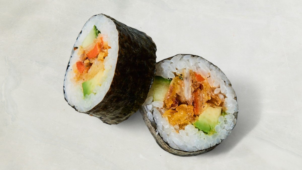 Crispy kylling, sushi-ris, agurk, avocado, tangsalat, edamame-bønner, marinerede rødløg, radiser, mango, ingefær, gulerødder og forårsløg.