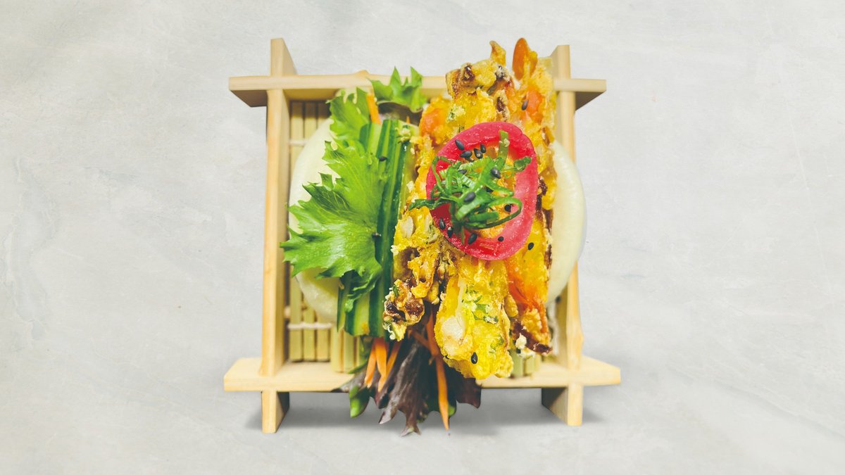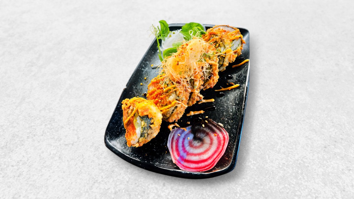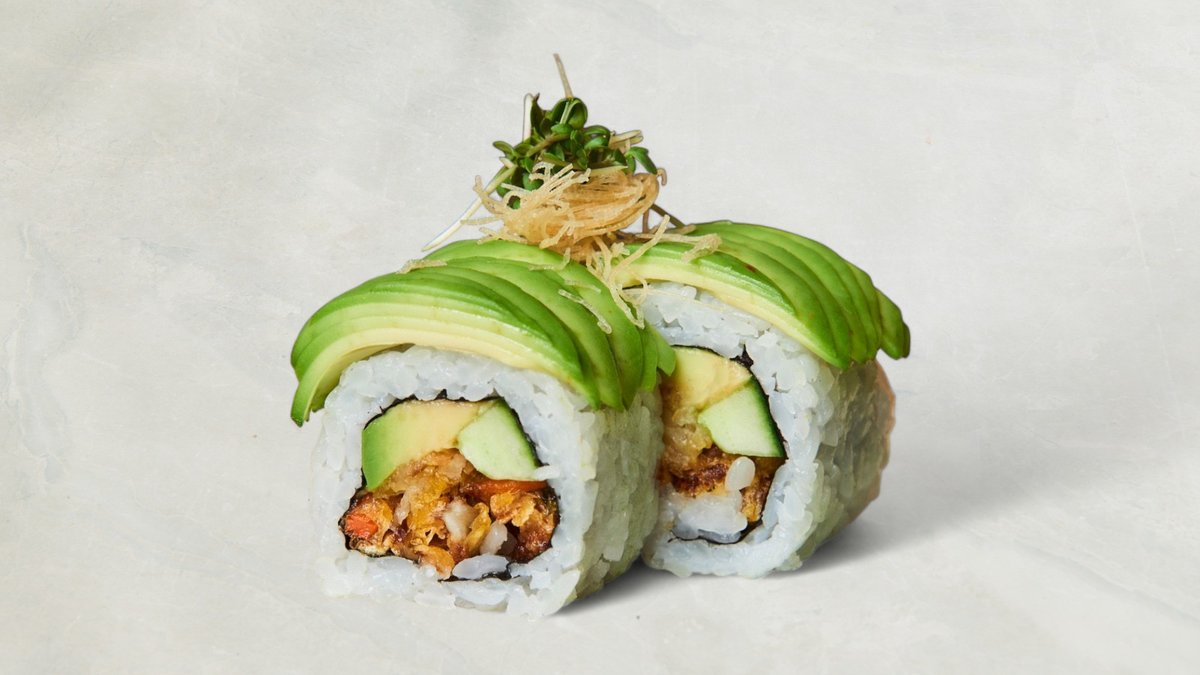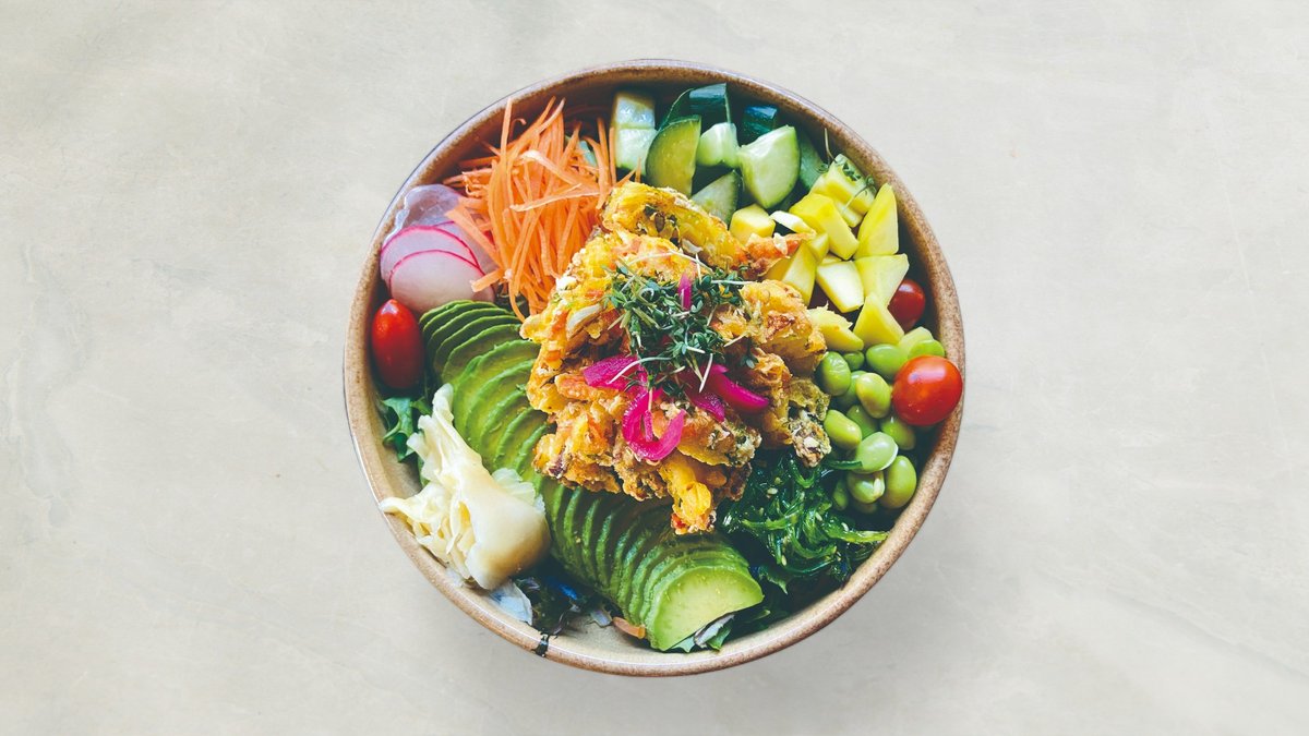 Crispy grøntsags kakiyaki, sushi-ris, agurk, avocado, tangsalat, edamame-bønner, marinerede rødløg, radiser, mango, ingefær, gulerødder og forårsløg.