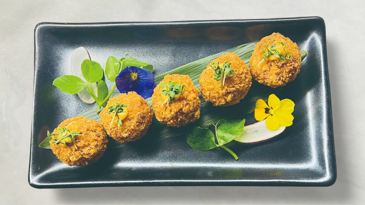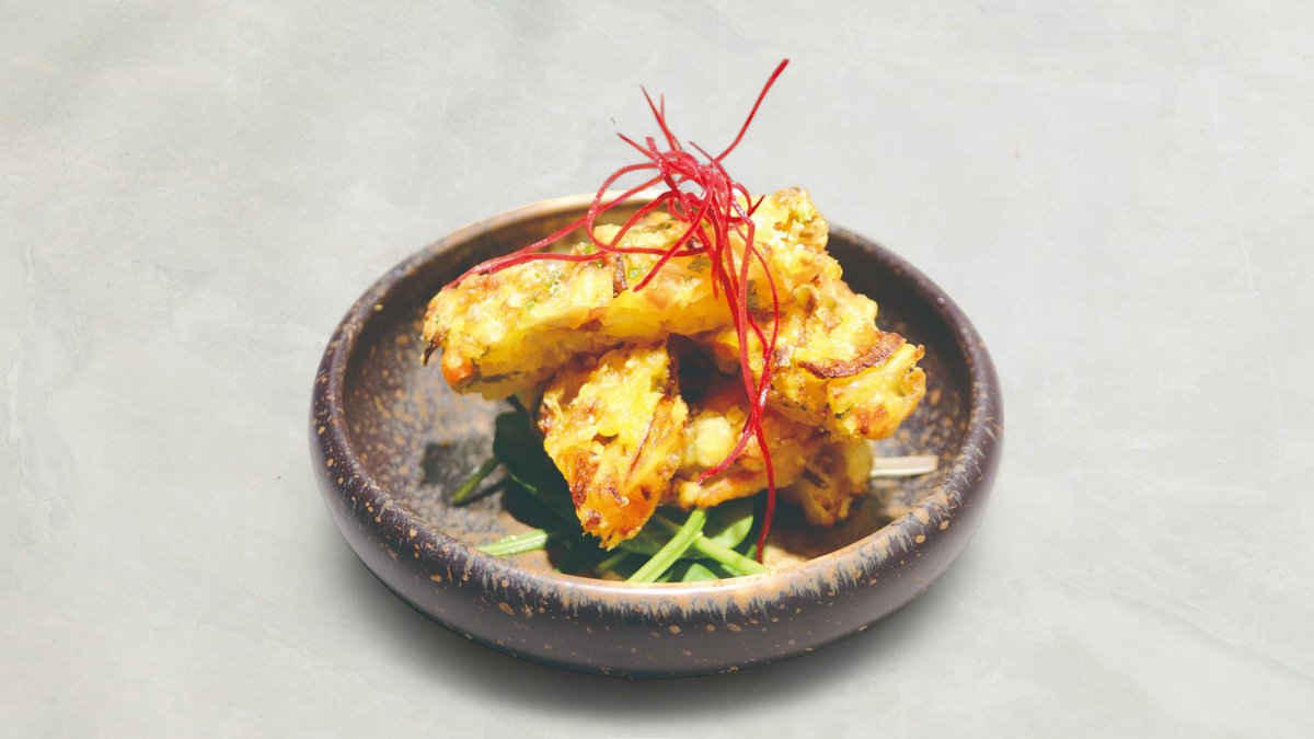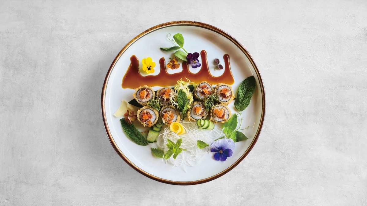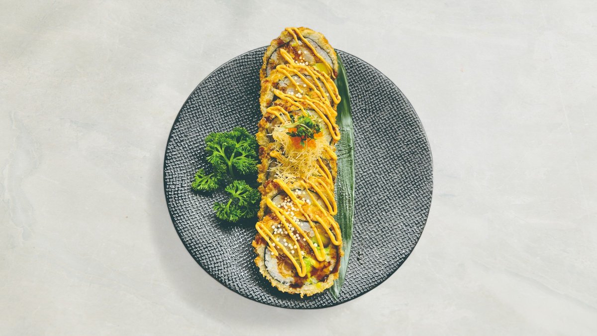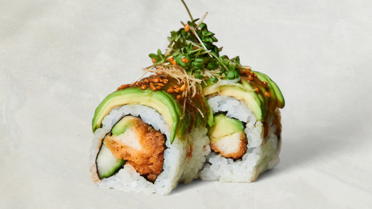 Crispy grøntsags kakiyaki, sushi-ris, agurk, avocado, tangsalat, edamame-bønner, marinerede rødløg, radiser, mango, ingefær, gulerødder og forårsløg.