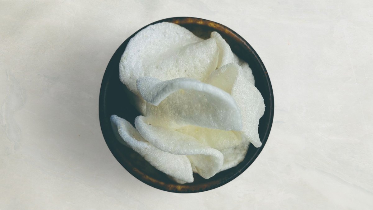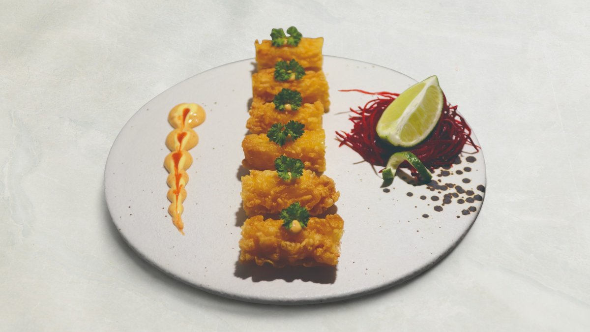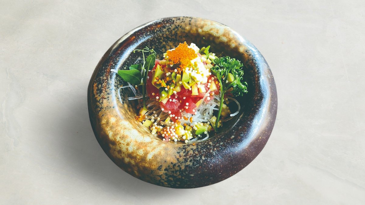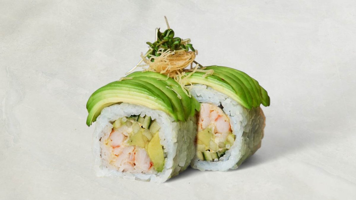 Crispy reje, avocado, agurk, gulerødder og spæde salatblade serveres med goma dressing.