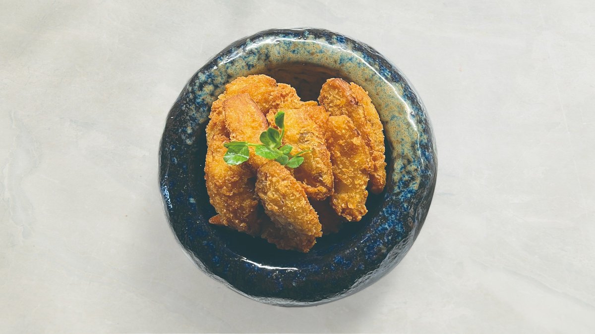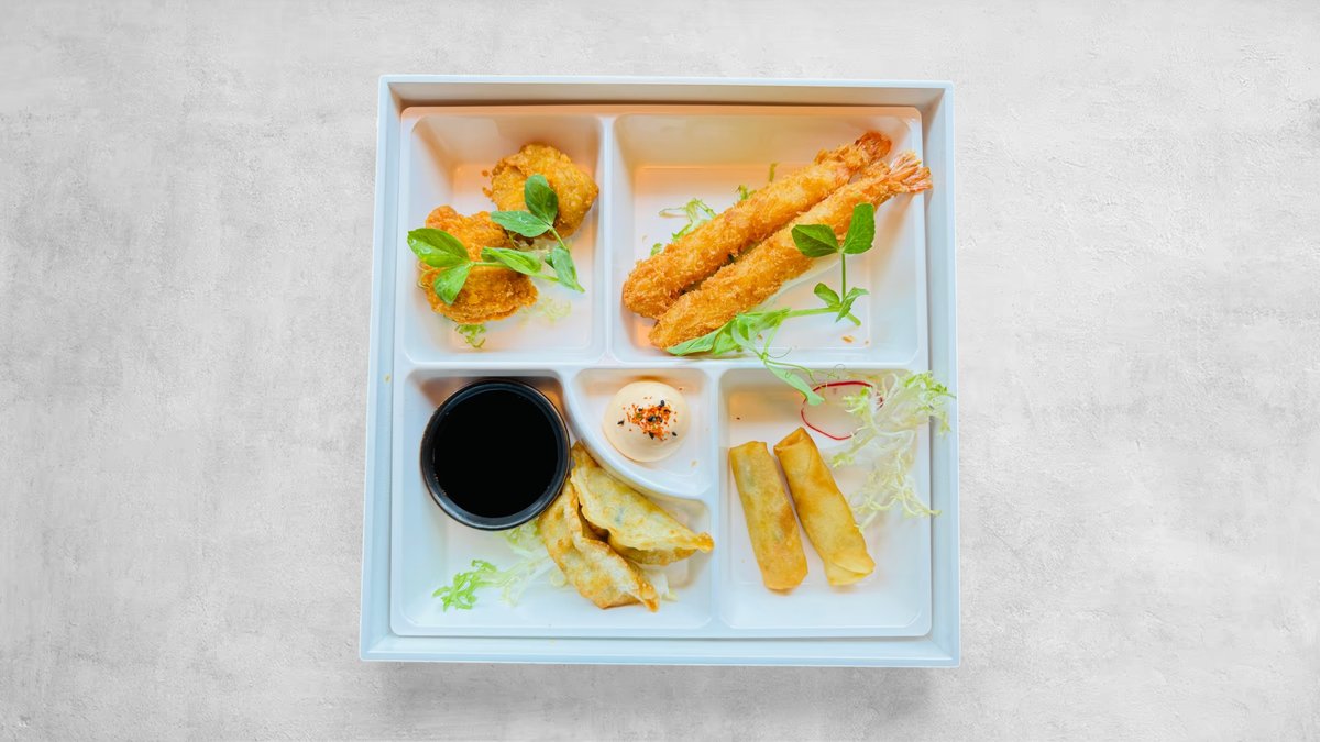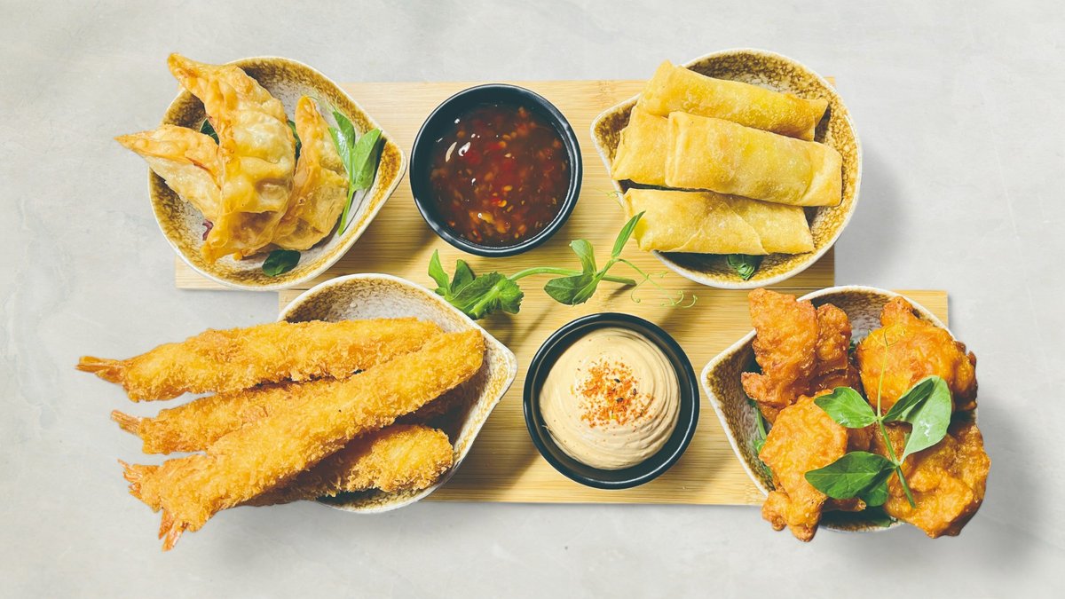 2 stk Ebi Fry,2stk mini forårsruller,2stk dybstegte dumplings med kylling,2stk kylling karaage