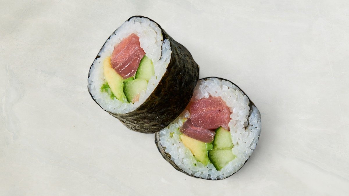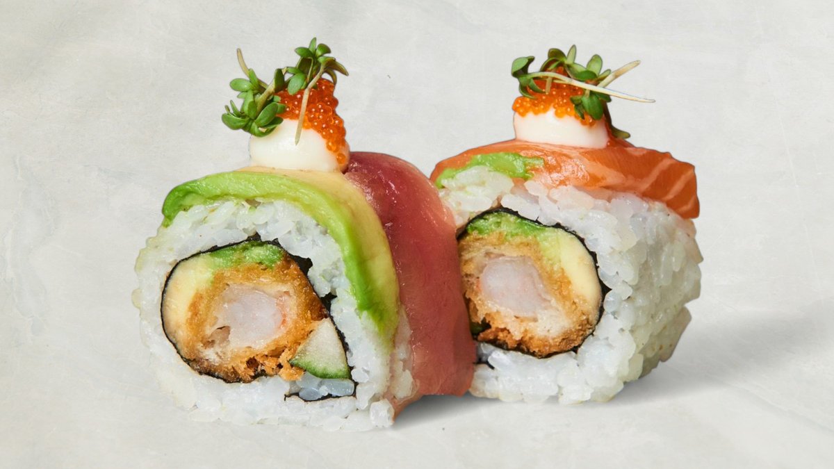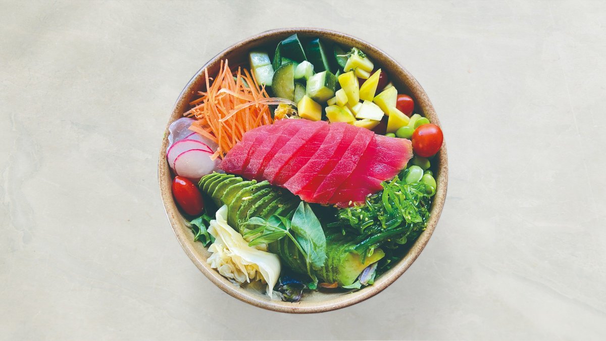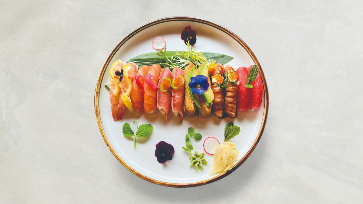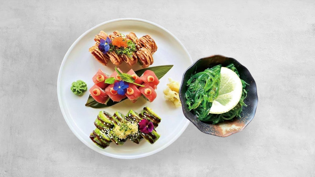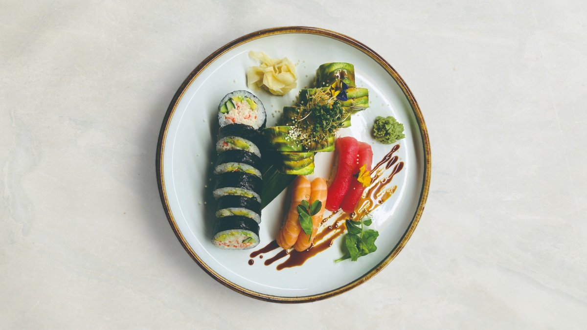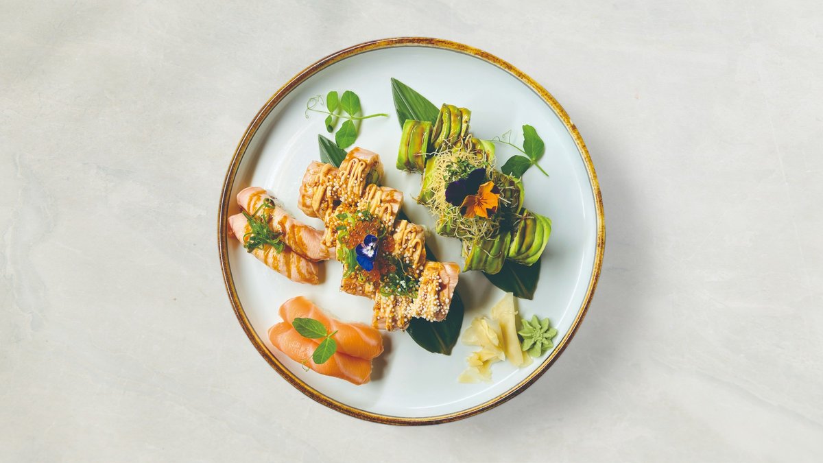 Tun, sushi-ris, agurk, avocado, tangsalat, edamame-bønner, marinerede rødløg, radiser, mango, ingefær, gulerødder og forårsløg.