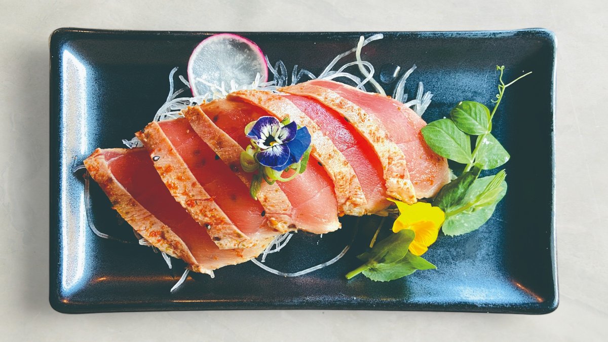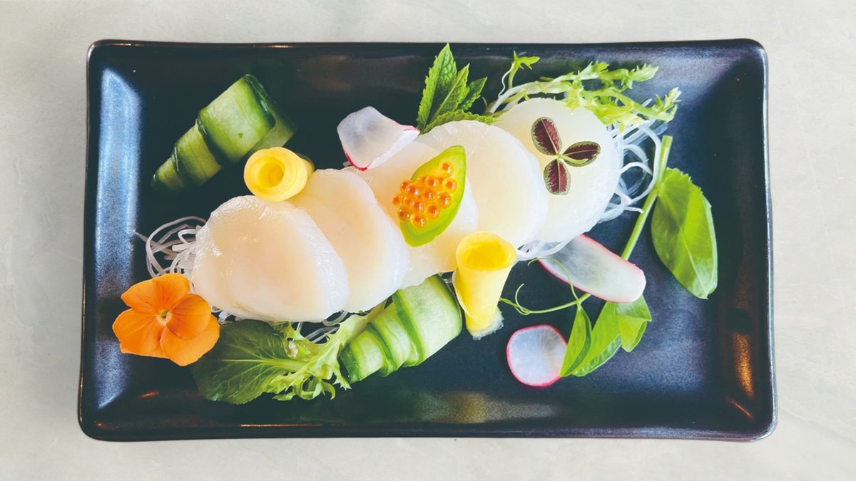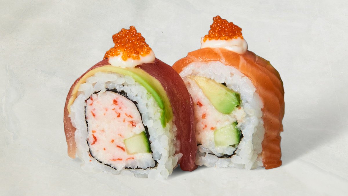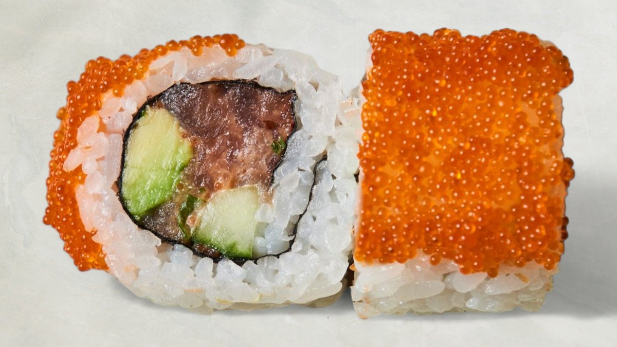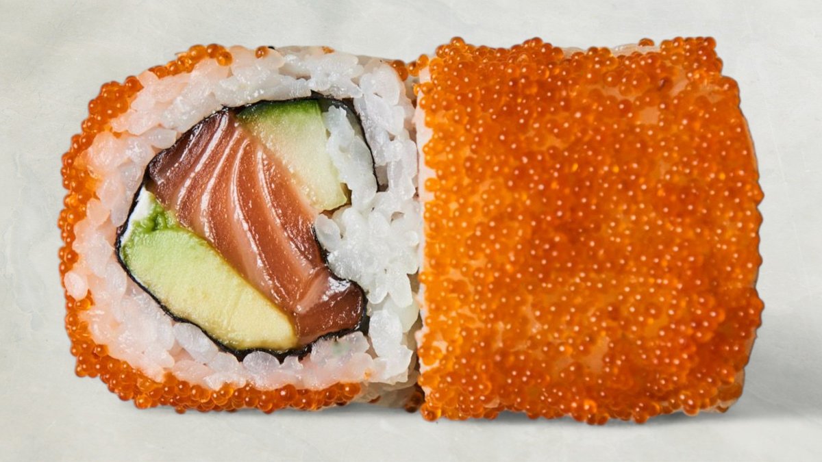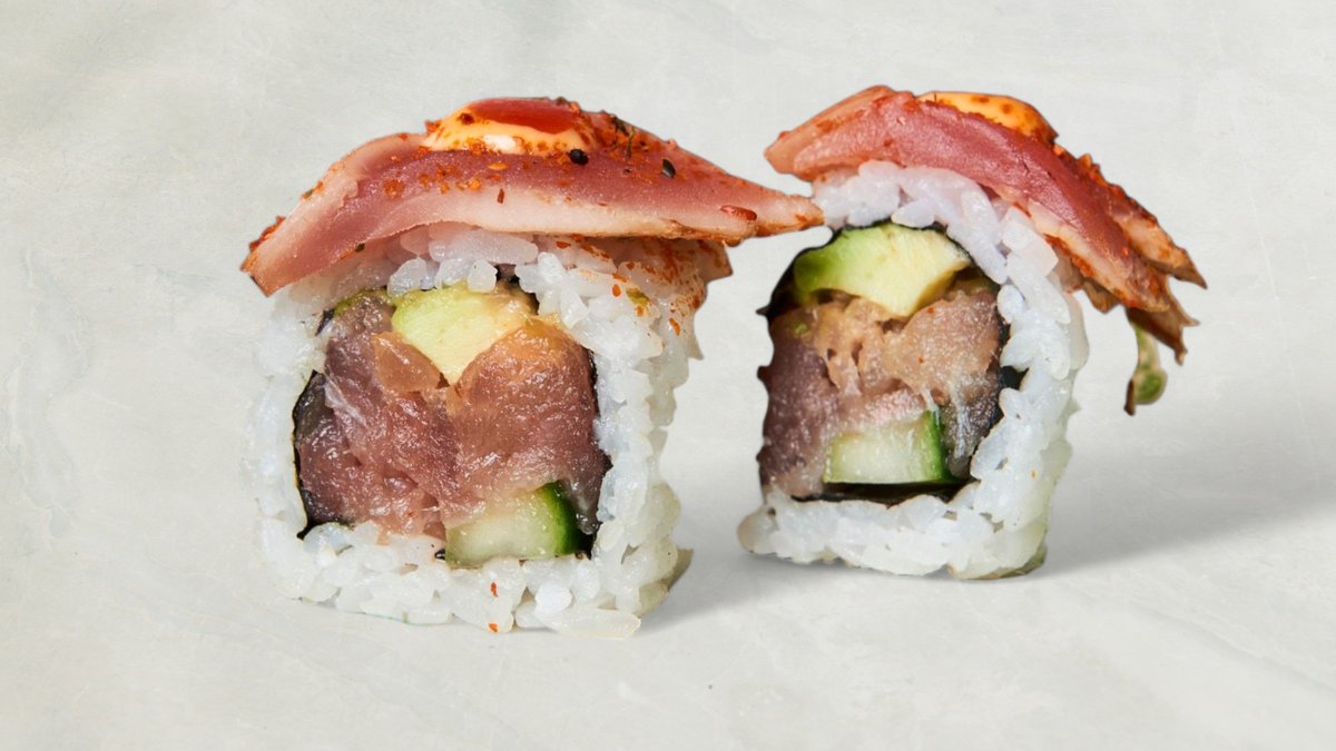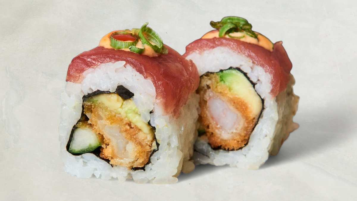 Tun, sushi-ris, agurk, avocado, tangsalat, edamame-bønner, marinerede rødløg, radiser, mango, ingefær, gulerødder og forårsløg.