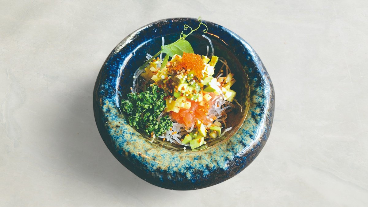 Laks, avocado, agurk, gulerødder og spæde salatblade serveres med gomadressing.