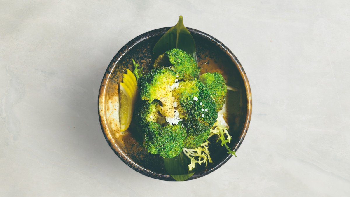 Oksekød i teriyaki serveret med sushi-ris, grillet broccoli og toppet med forårsløg.