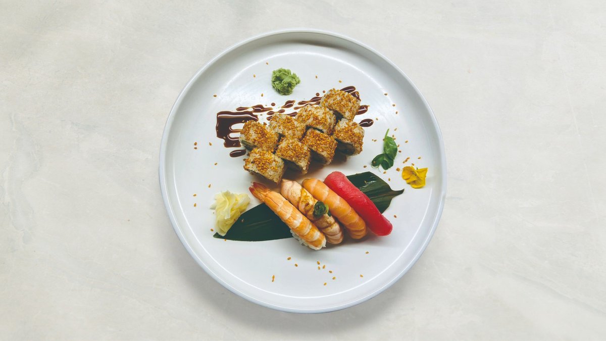 Nigiri: 1 x laks 1 x grillet laks 1 x tun 1 x reje Uramaki: 8 x Spicy rejer.