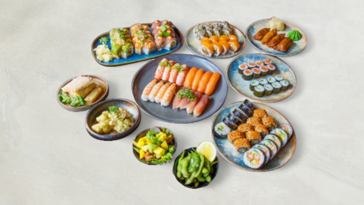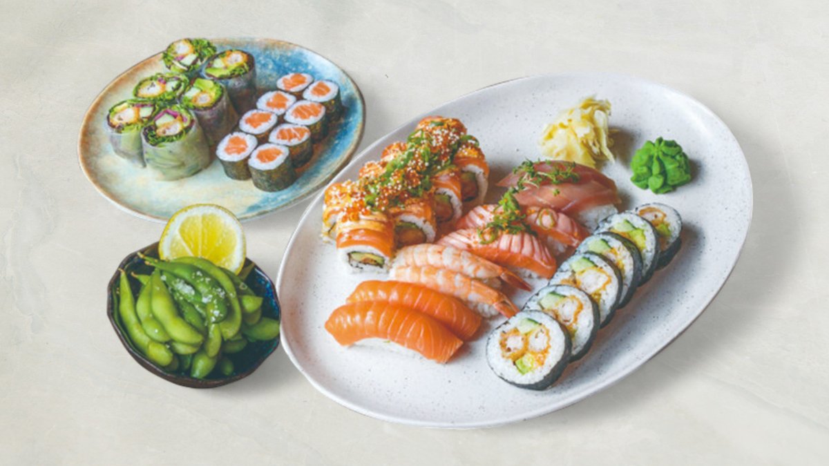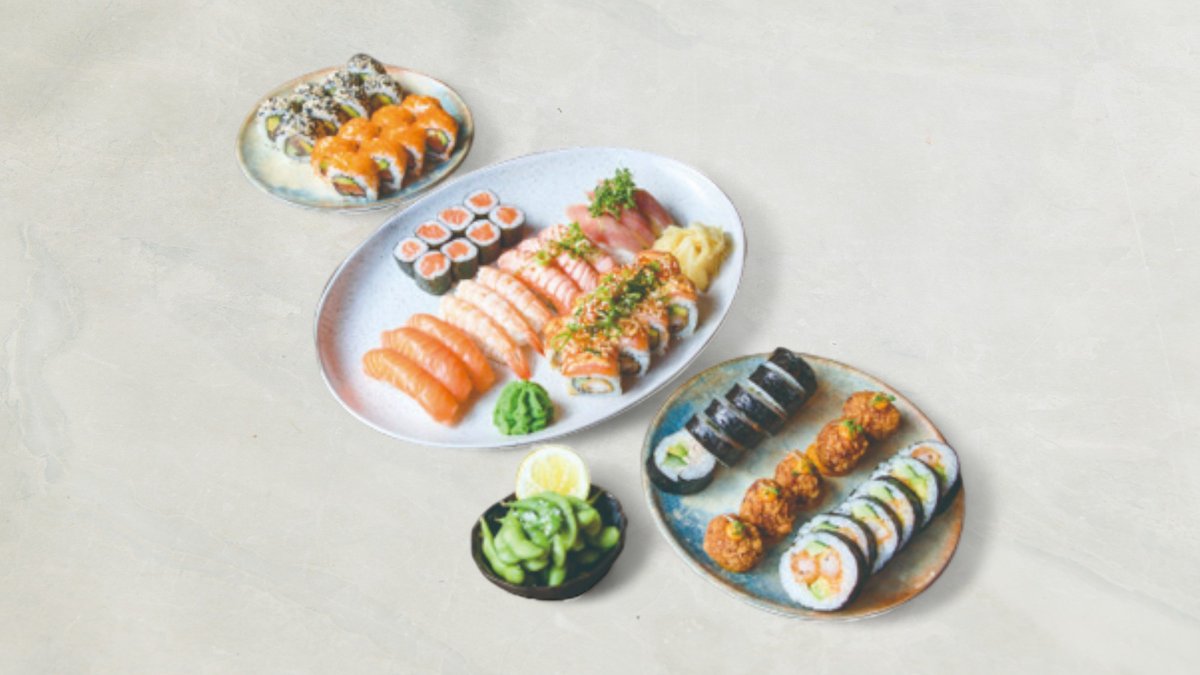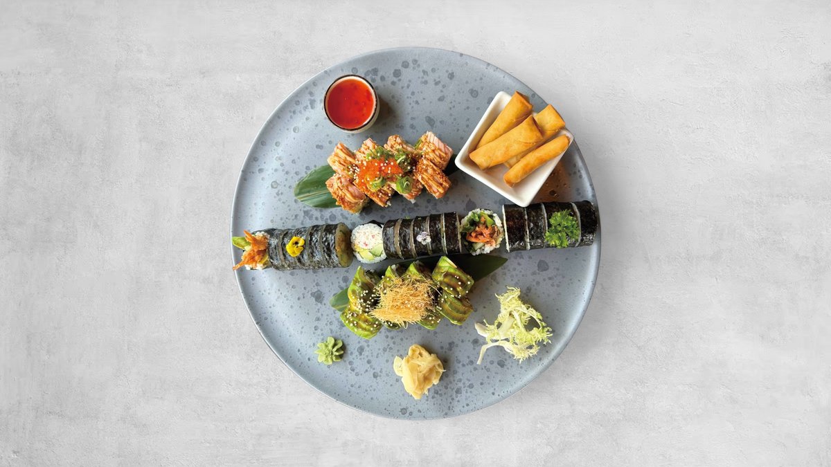 Forretter: Edmame-bønner, croquettes med ris og laks Nigiri: 3 x laks 3 x tun 3 x rejer 3 x grillet laks Hosomaki: 8 x laks Uramaki: 8 x Alaska 8 x Spicy tun Kaburimaki: 8 x Øresund Roll Futomaki: 6 x California 6 x Tempura-reje.