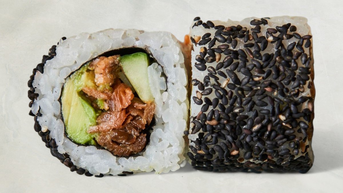 Oksekød, sushi-ris, agurk, avocado, tangsalat, edamame-bønner, marinerede rødløg, radiser, mango, ingefær, gulerødder og forårsløg.