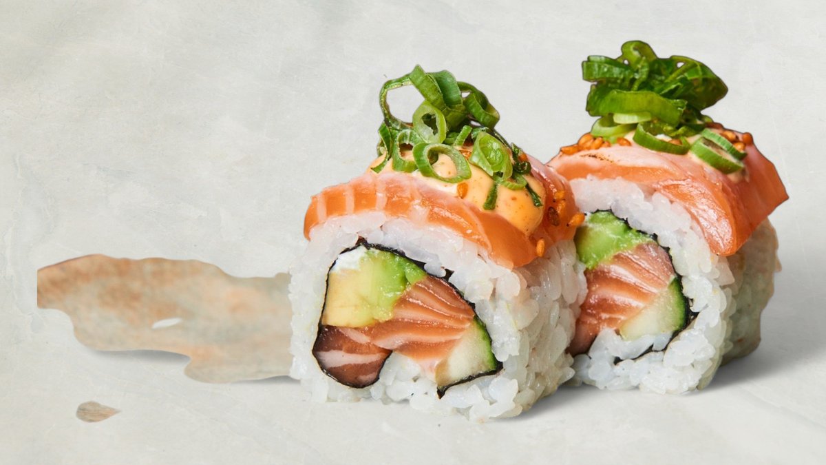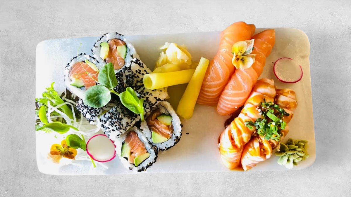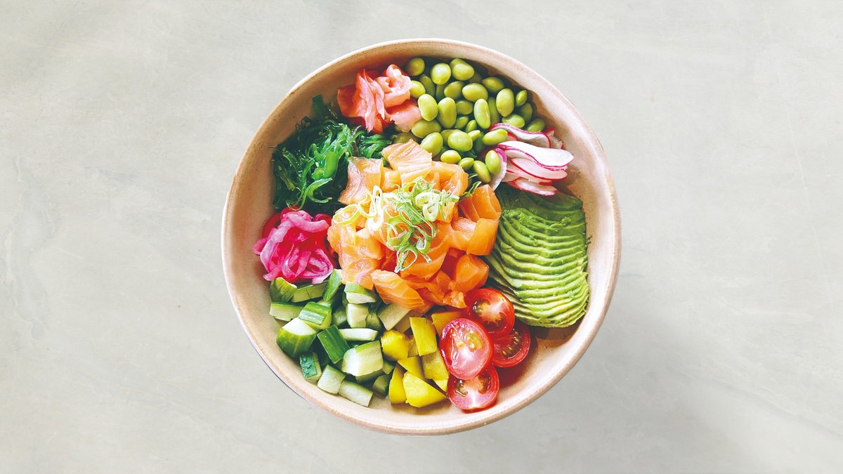Laks, sushi-ris, agurk, avocado, tangsalat, edamame-bønner, marinerede rødløg, radiser, mango, ingefær, gulerødder og forårsløg.