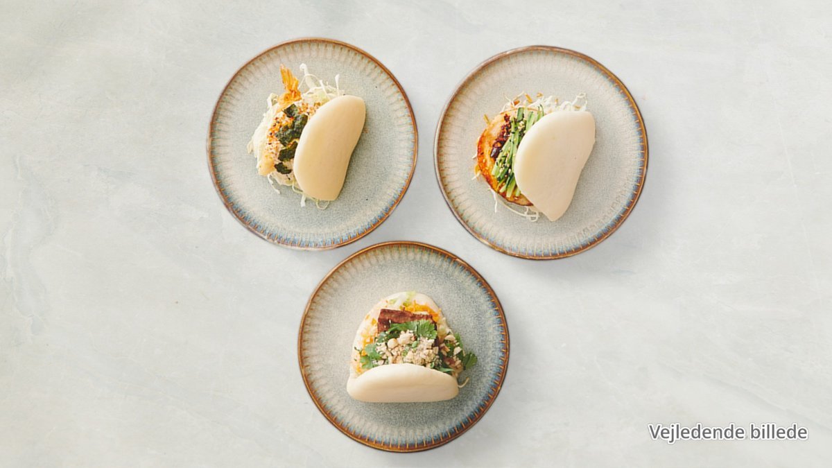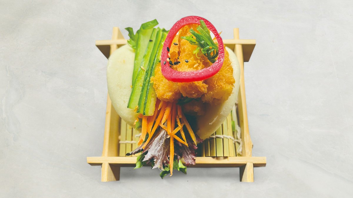 Lun kinesisk bao-bolle med fyld af tempura-reje, chilimayo, teriyaki, gomadressing, mix-salat, gulerødder, agurk, marinerede rødløg, forårsløg og sesam.